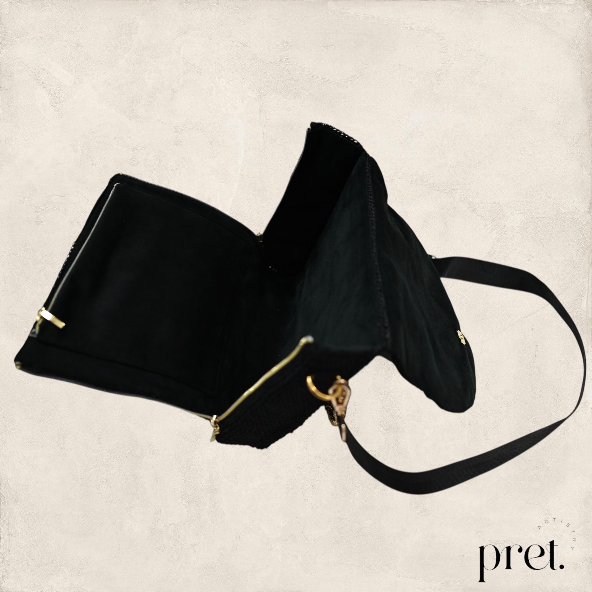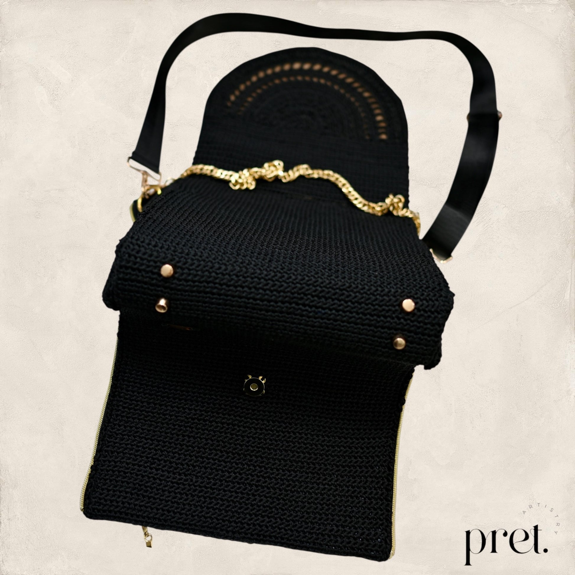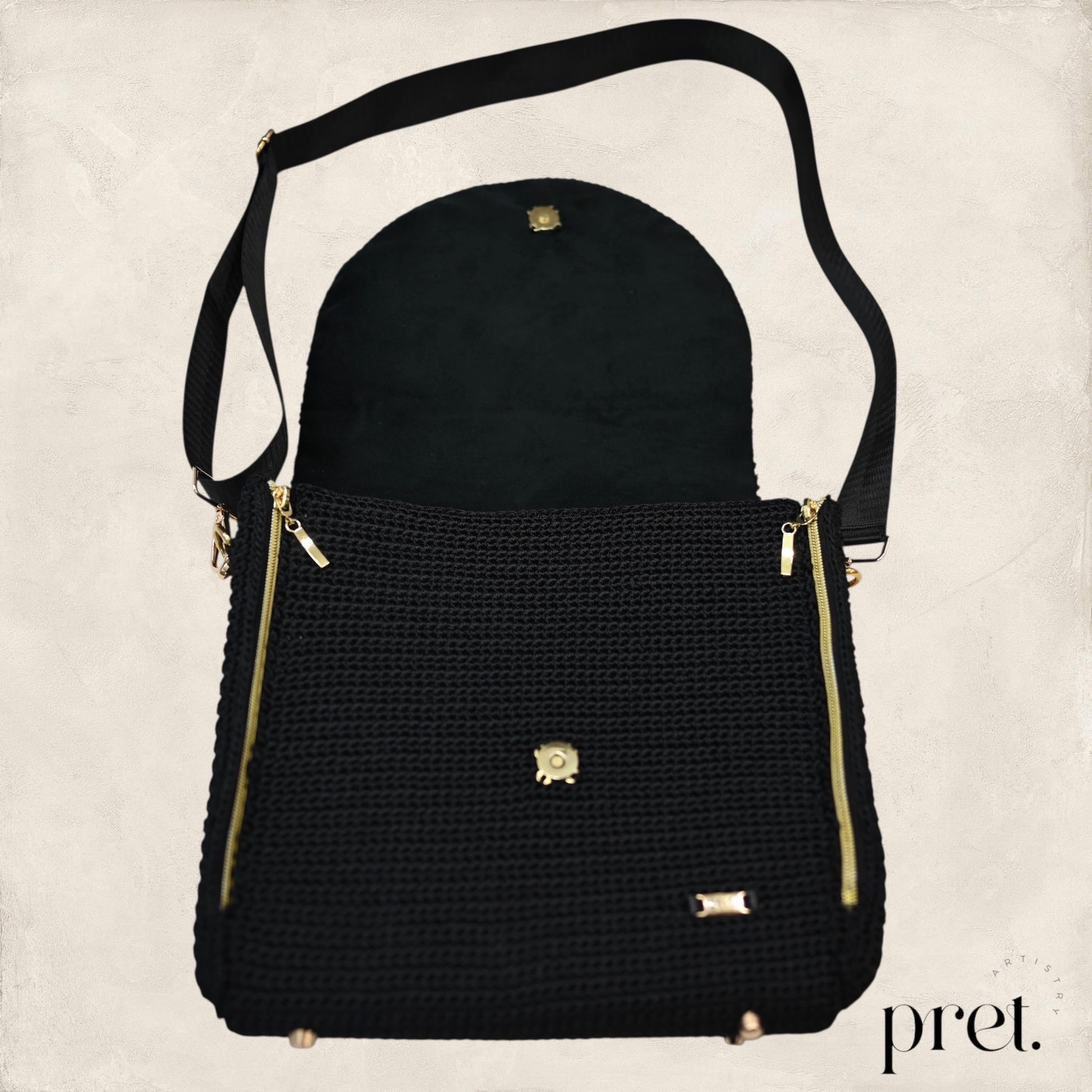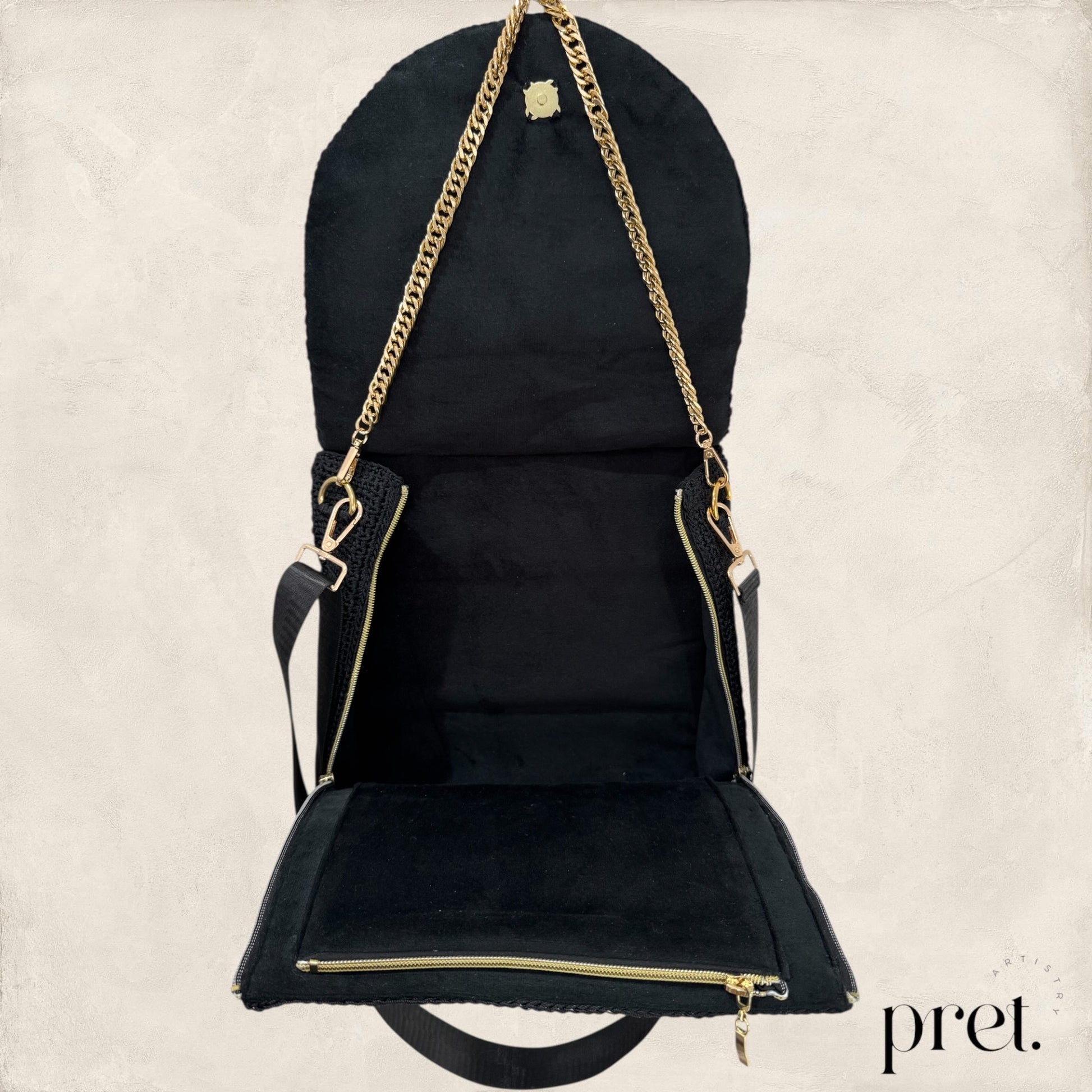 This handcrafted Black Velvet handbag features deep black satin yarn, a half-moon flap, and gold zippers. It has a soft velvet lining, adjustable strap, and a hidden chain for added style. Perfect for day or night, it blends classic design with modern details.