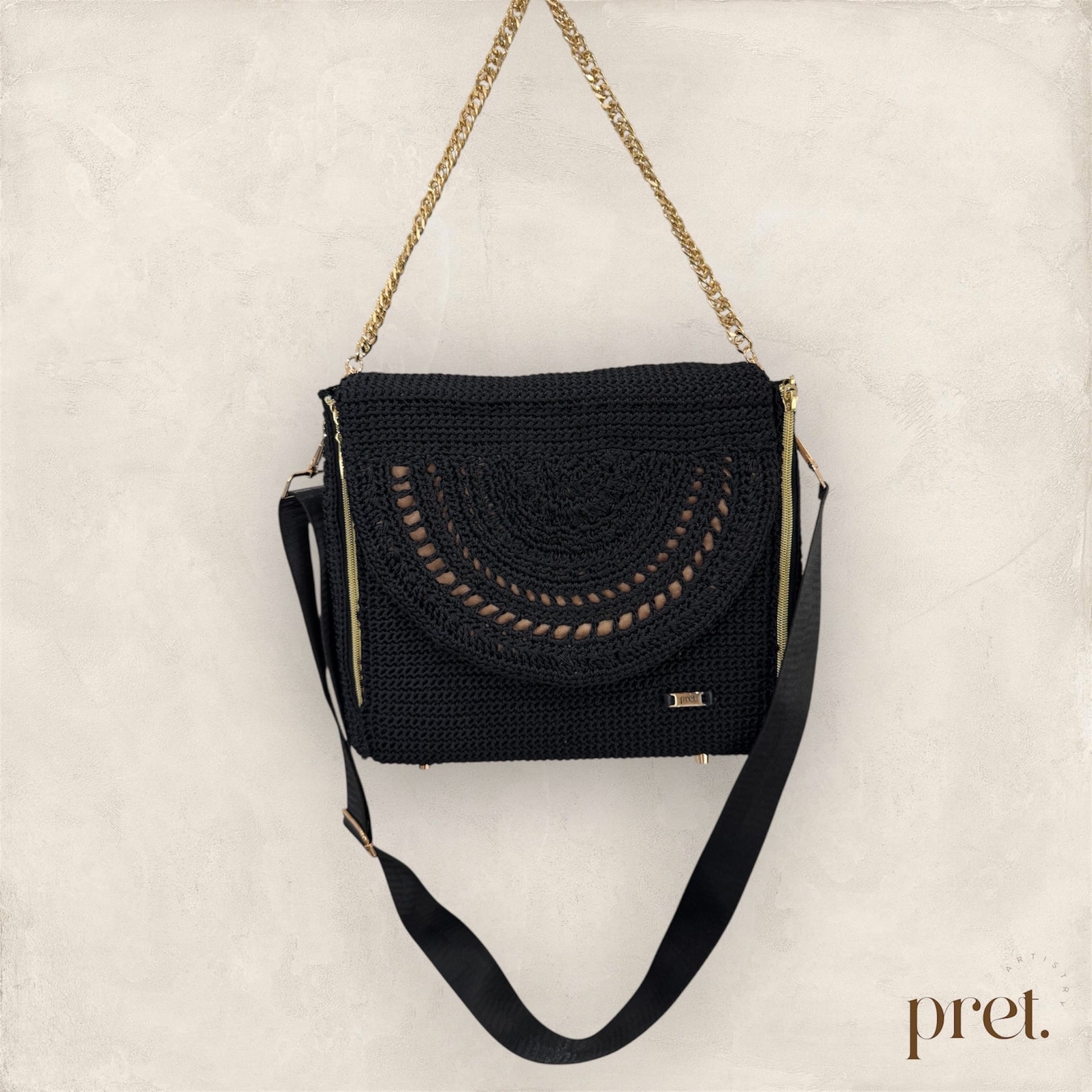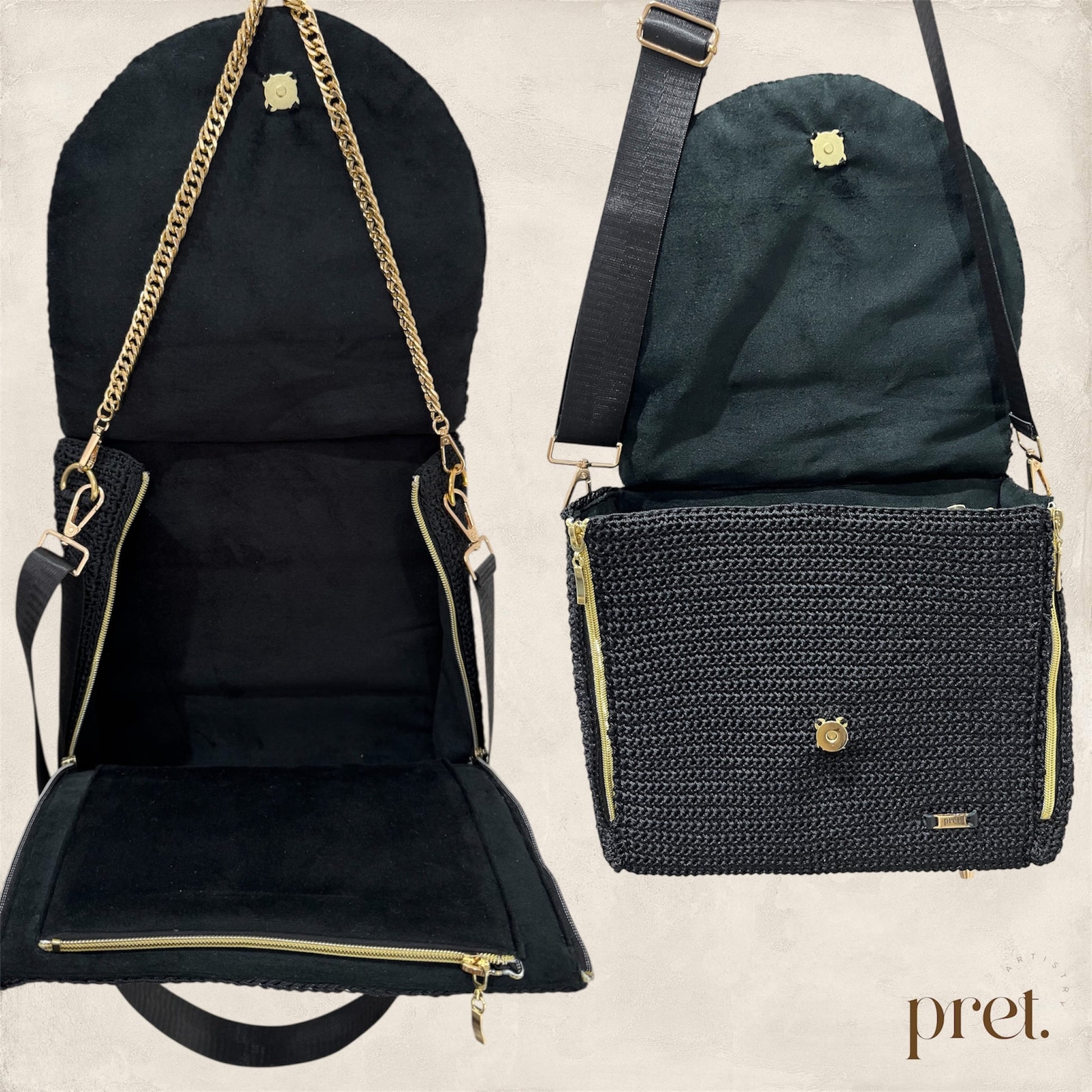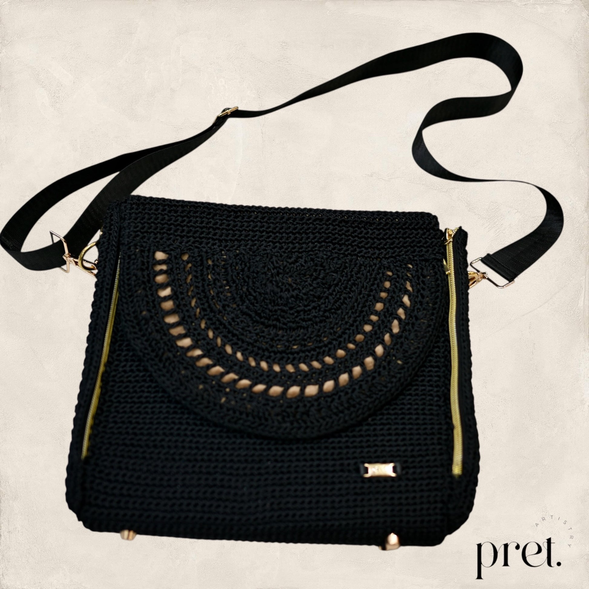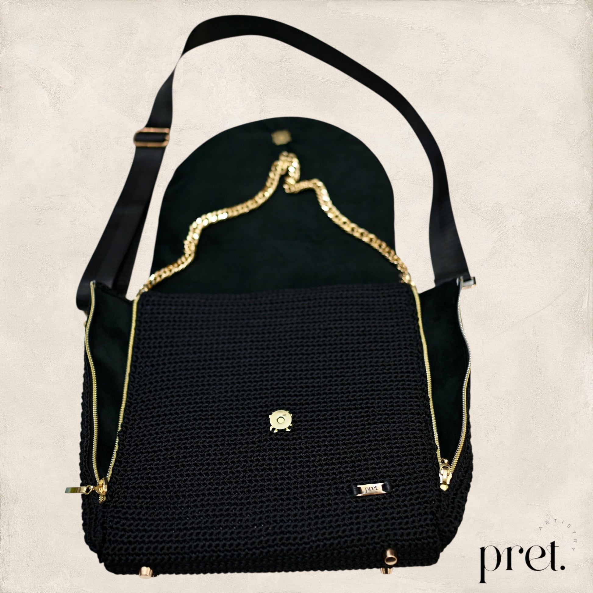 This handcrafted Black Velvet handbag features deep black satin yarn, a half-moon flap, and gold zippers. It has a soft velvet lining, adjustable strap, and a hidden chain for added style. Perfect for day or night, it blends classic design with modern details.