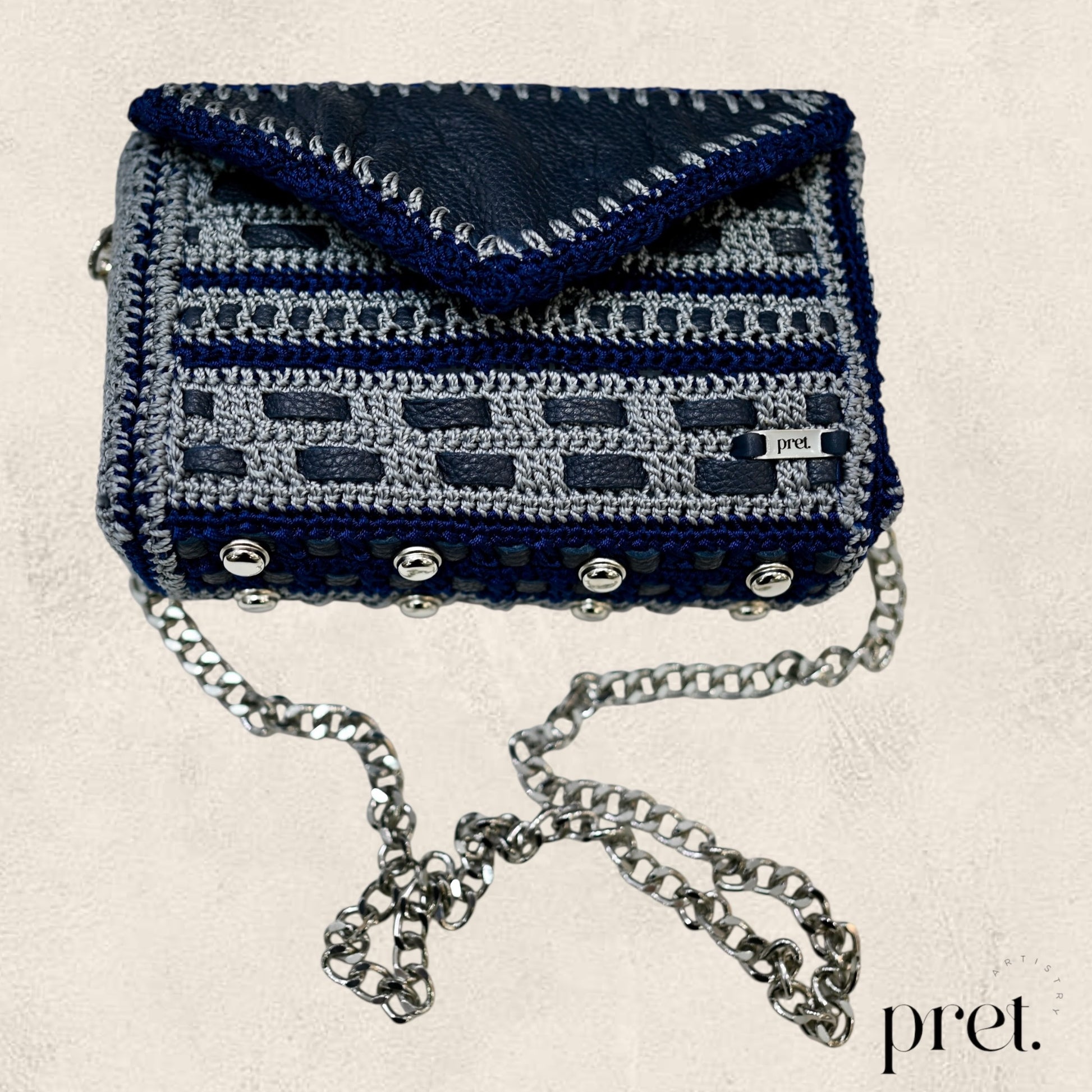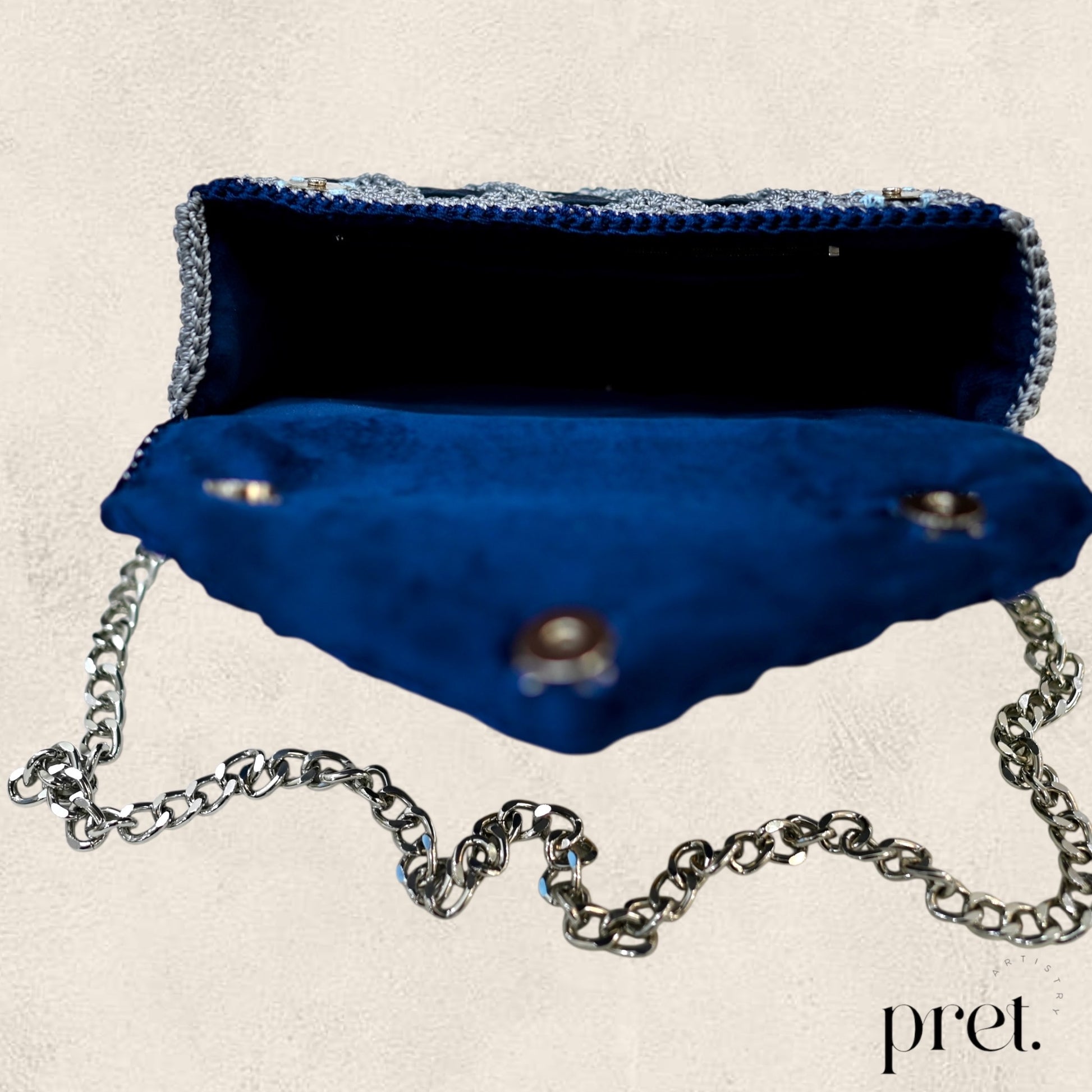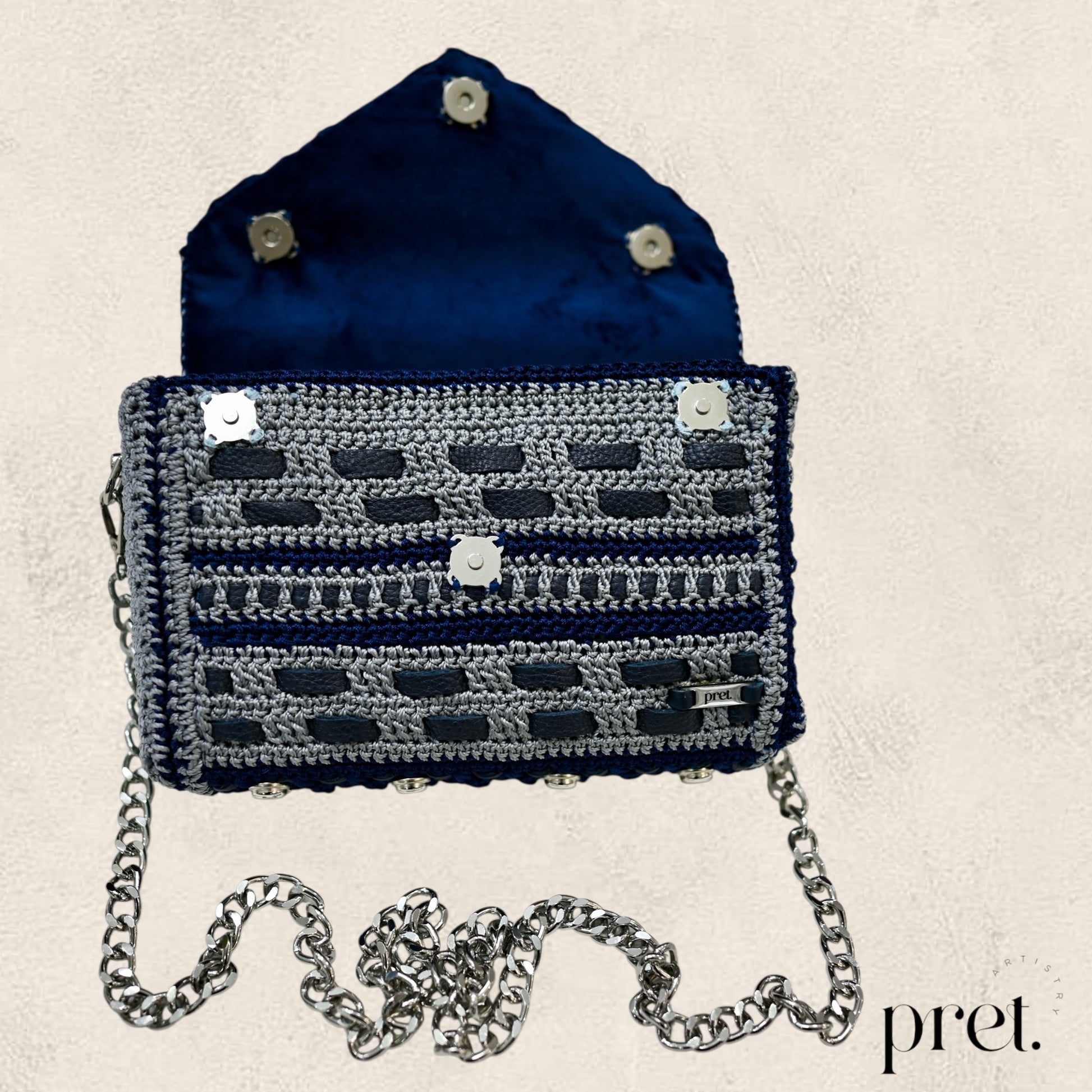 Blue District combines steel grey, navy, and leather in a stylish rectangular bag. It features detailed crochet textures, genuine leather accents, and a silver chain strap. Inside, a soft deep blue velvet lining adds luxury. Finished with magnetic closures and polished rivets, this bag offers both style and function for everyday urban wear.