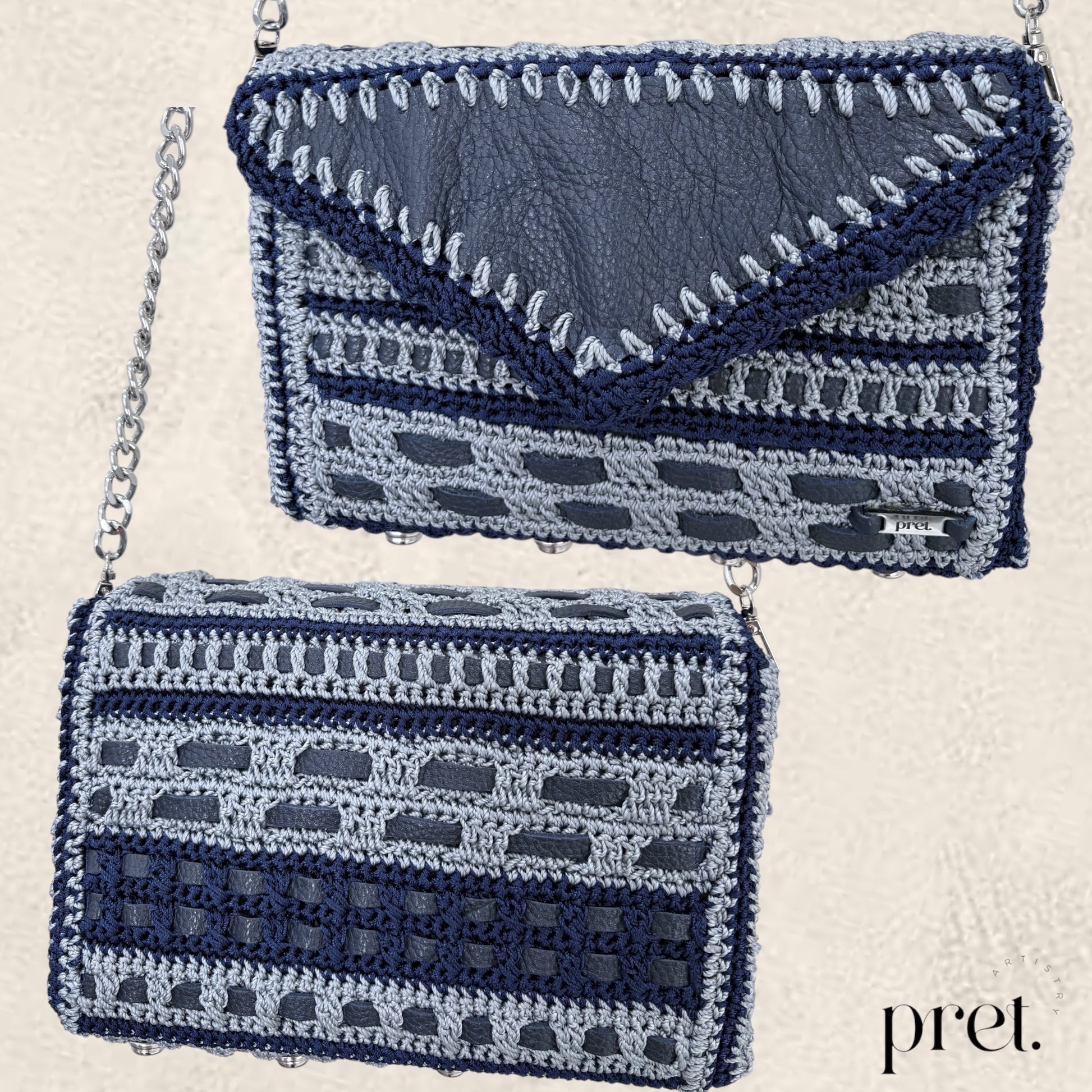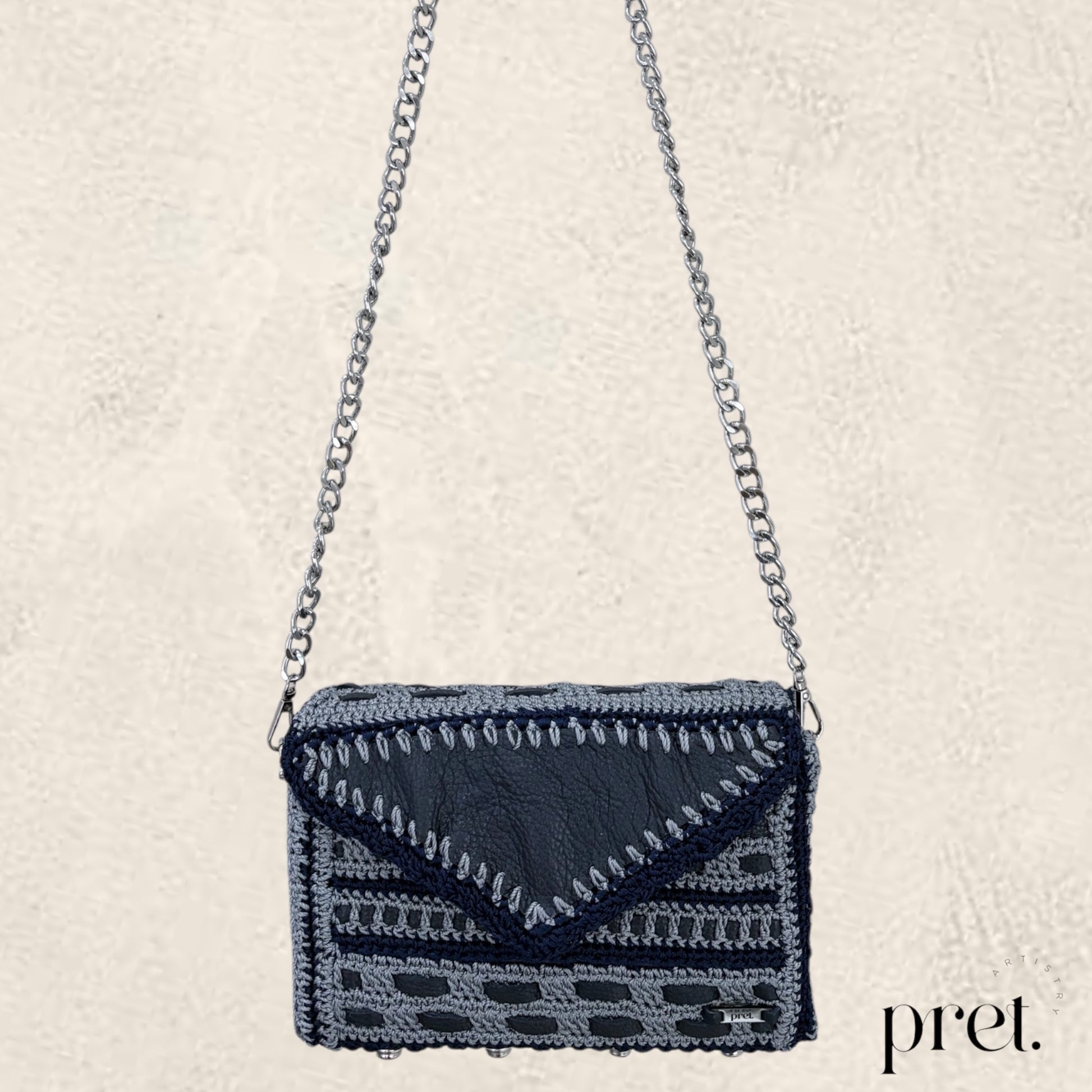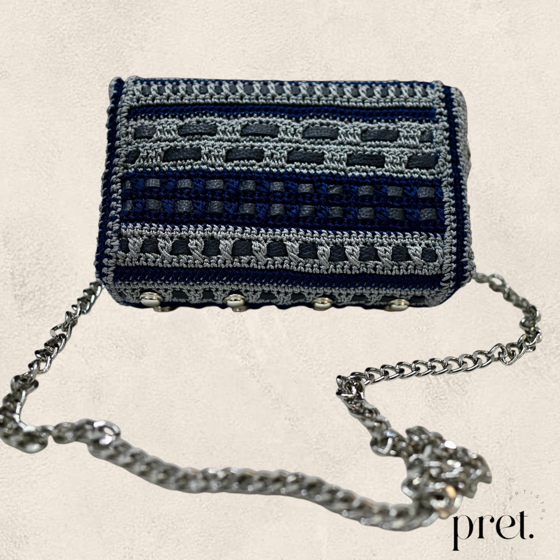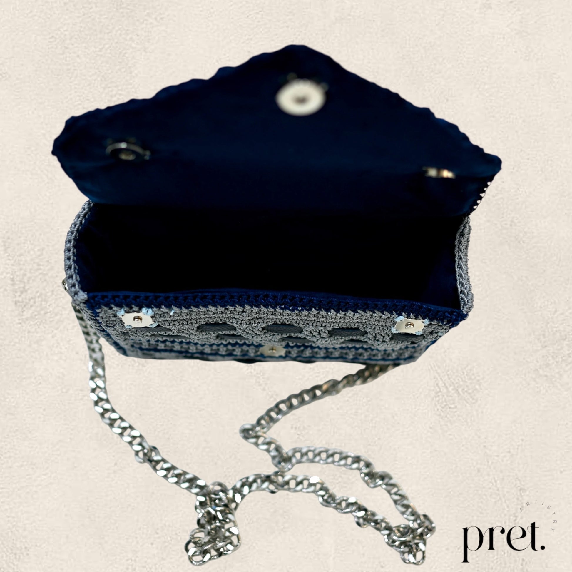 Blue District combines steel grey, navy, and leather in a stylish rectangular bag. It features detailed crochet textures, genuine leather accents, and a silver chain strap. Inside, a soft deep blue velvet lining adds luxury. Finished with magnetic closures and polished rivets, this bag offers both style and function for everyday urban wear.