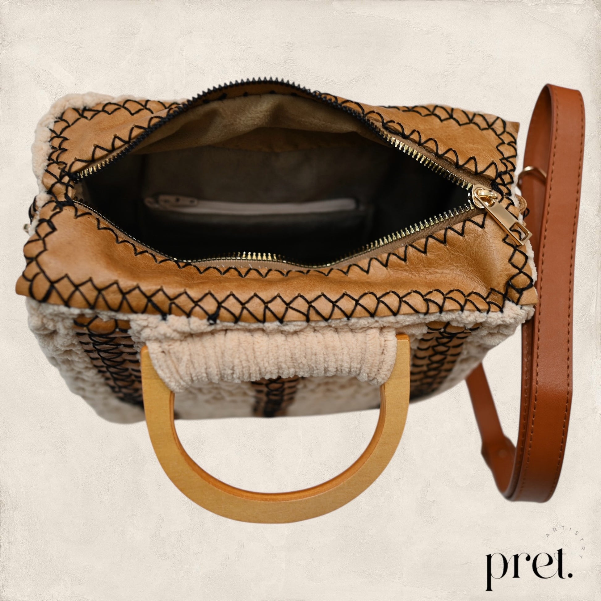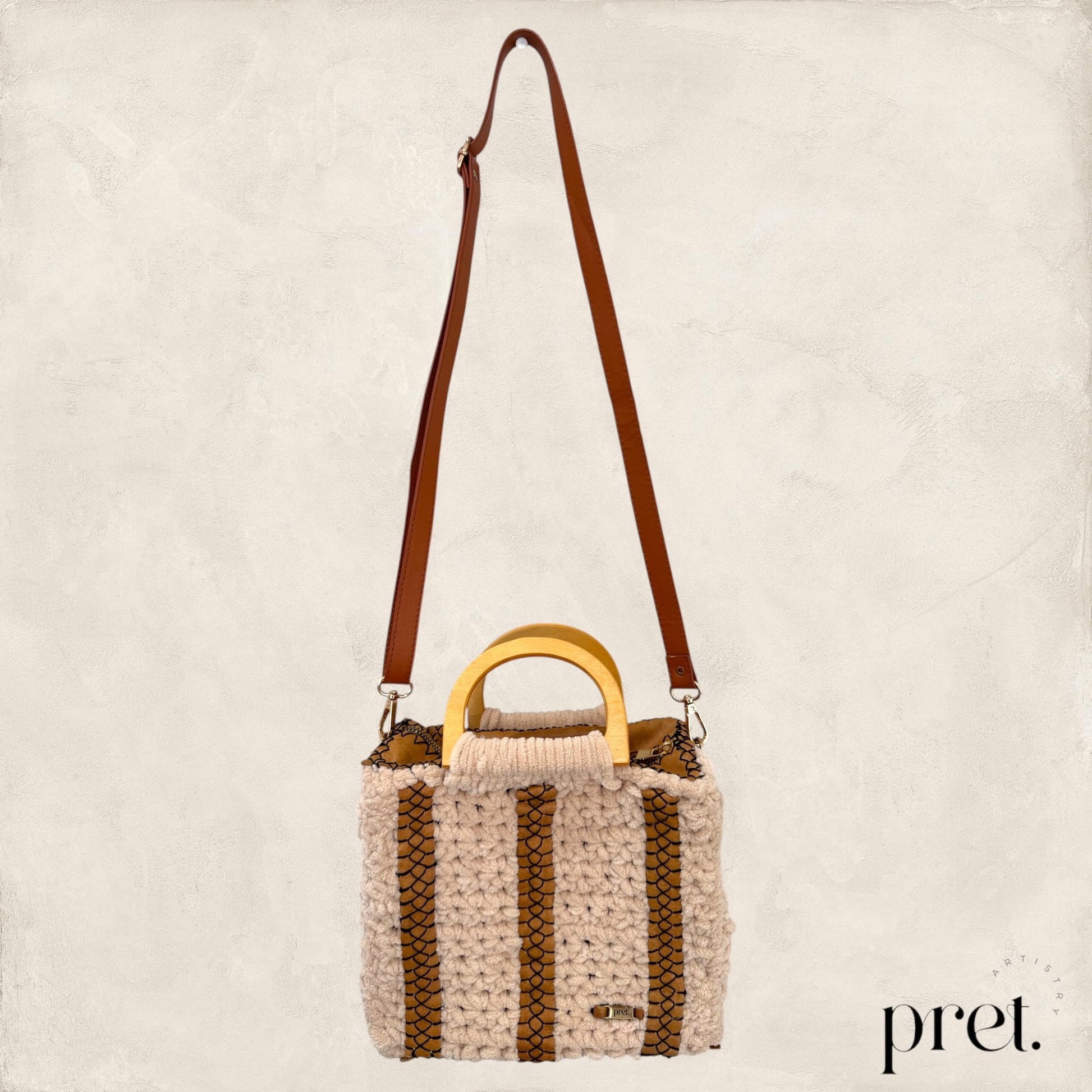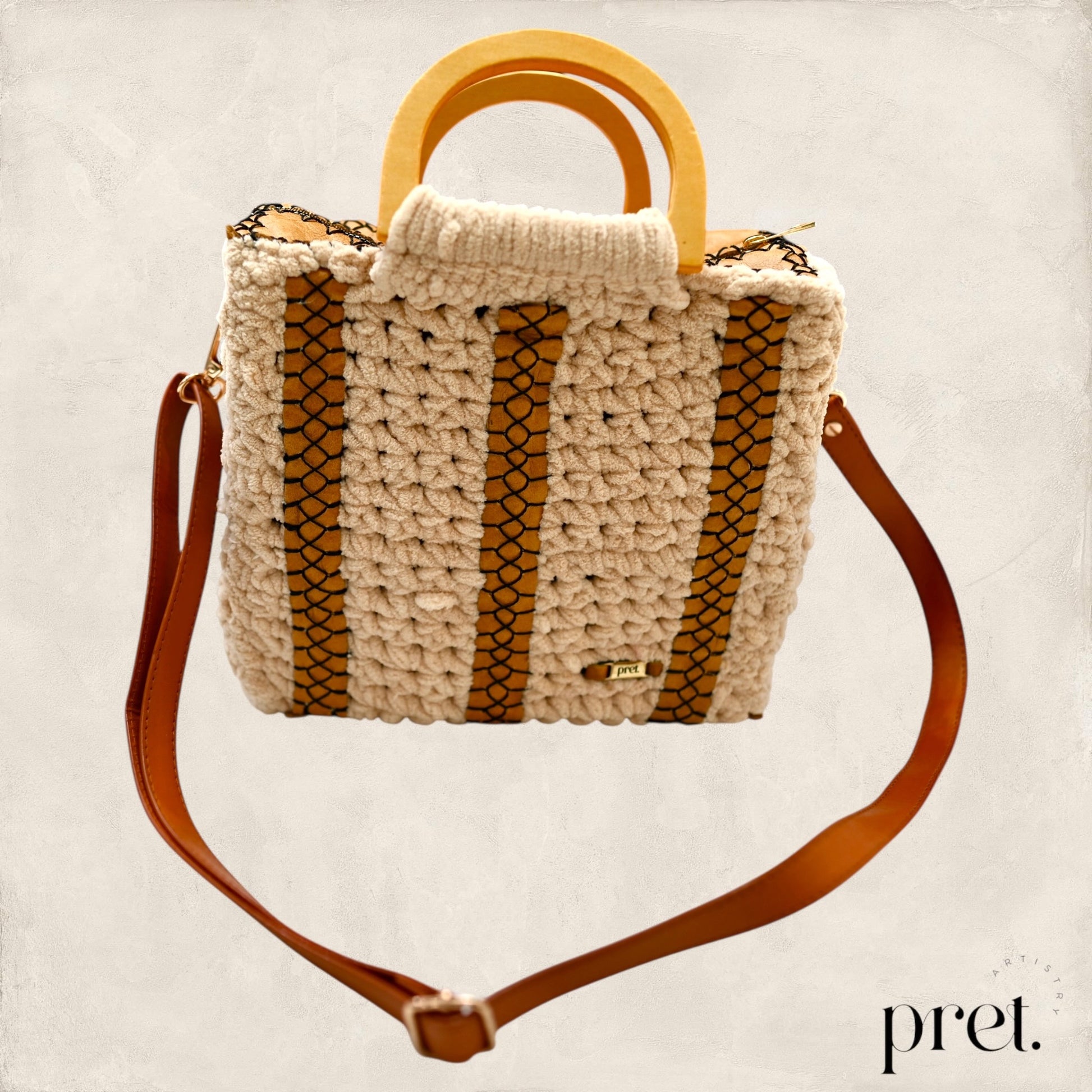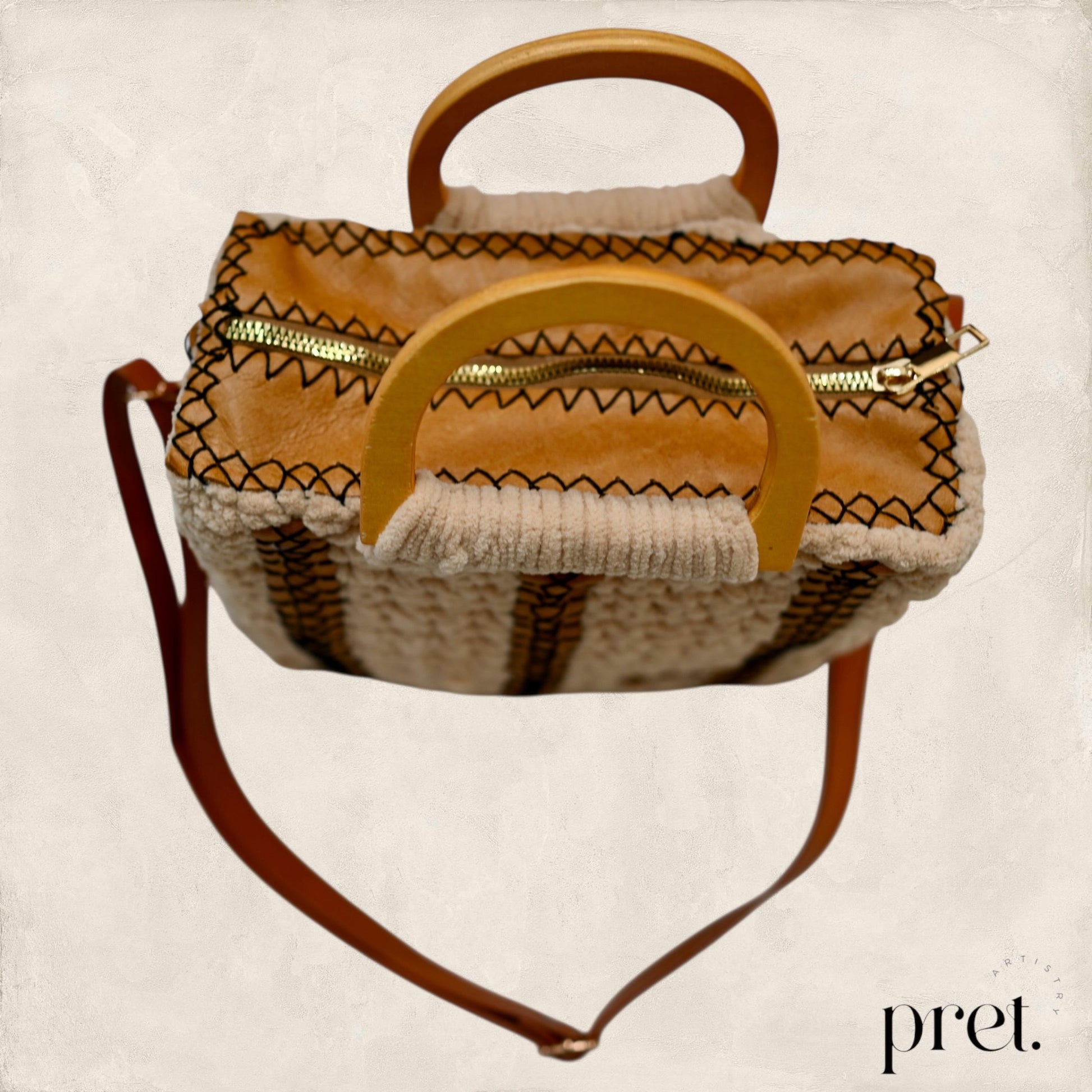 The Cinnamon Cuddle handbag features soft cream crochet with stitched leather stripes, wooden handles, and a brown faux leather shoulder strap. Inside, it has a golden velvet lining and a zip pocket, blending craftsmanship with elegant design for a stylish, practical accessory.