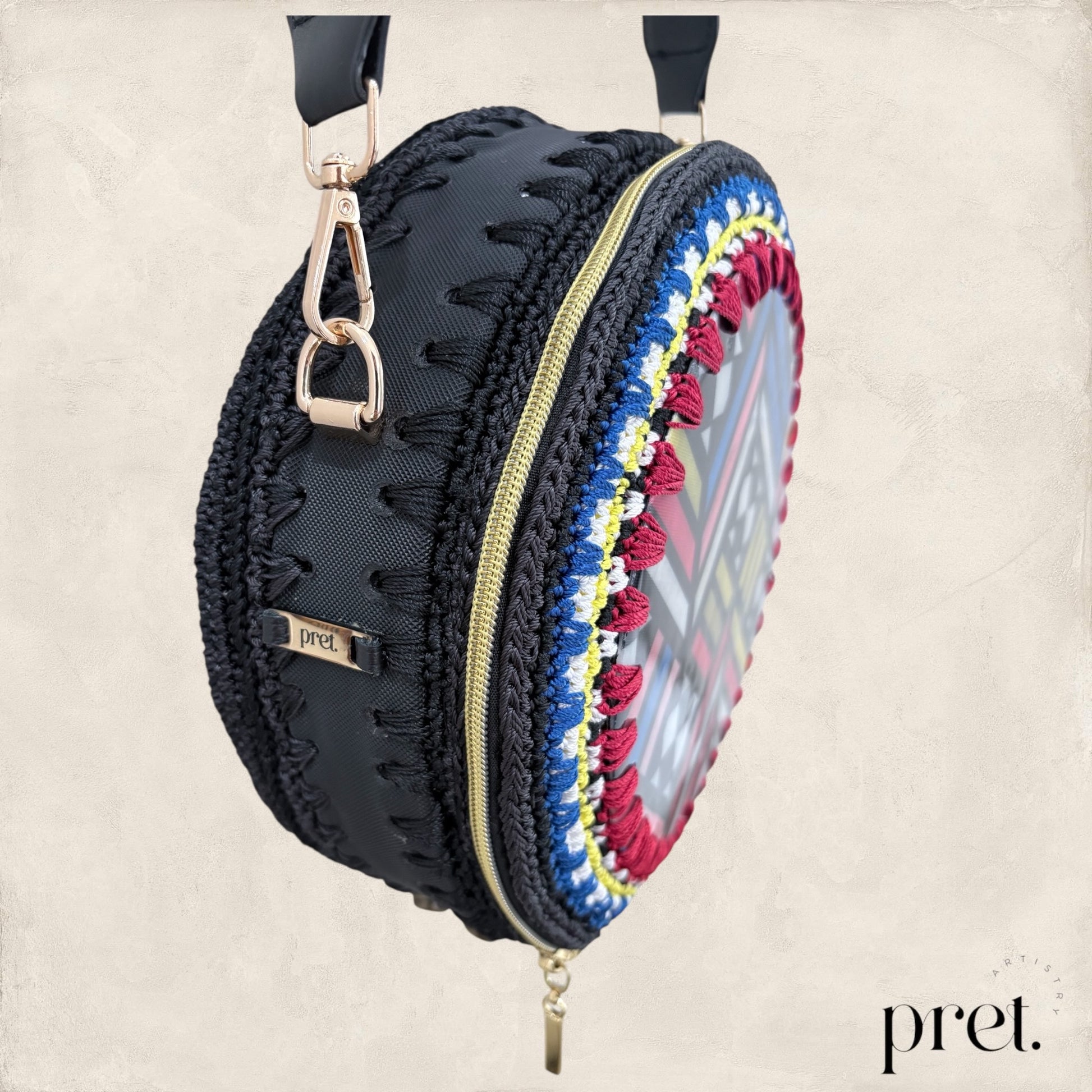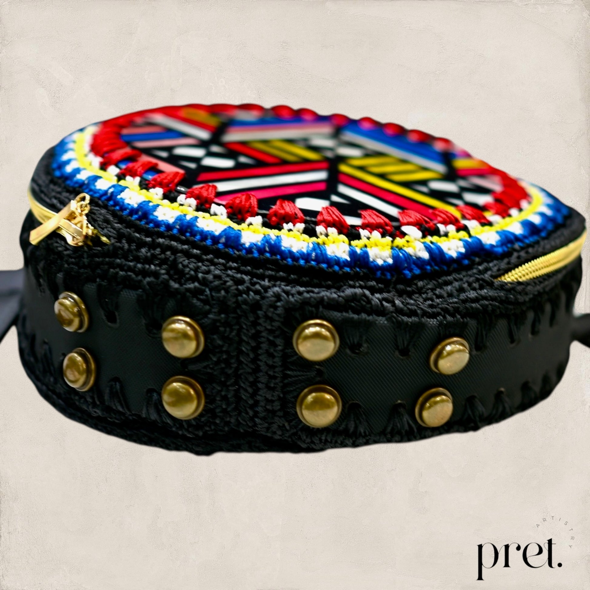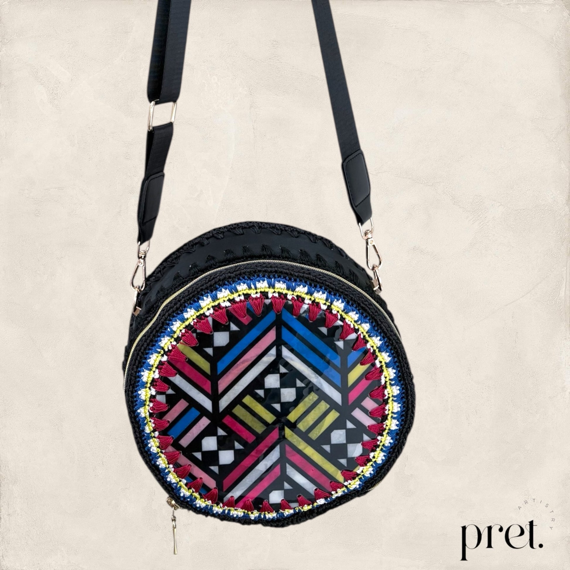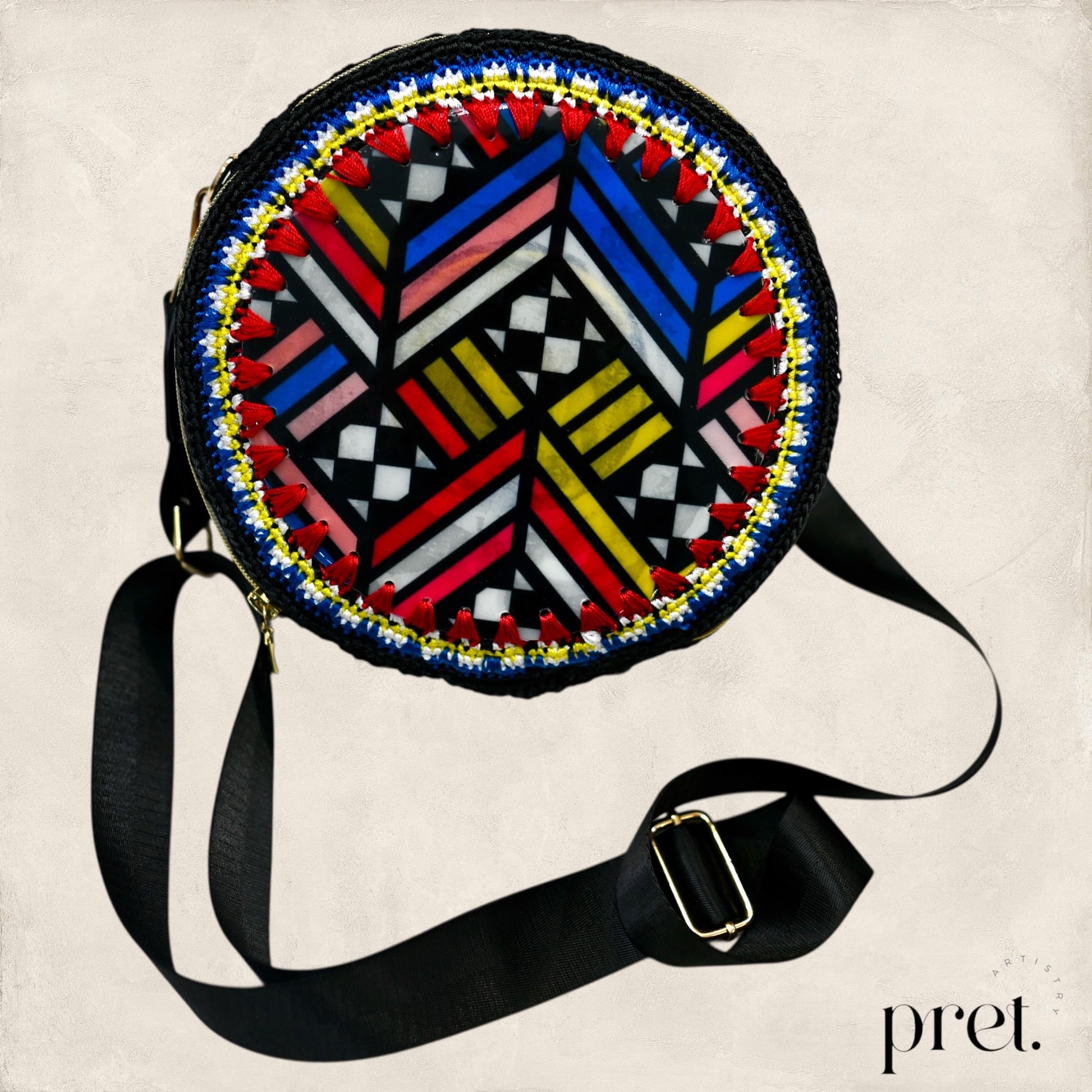 The Graphic Groove handbag features a round shape with a colorful geometric design, black, blue,red,yellow and white crochet edges, and a gold zipper. Its wide adjustable strap offers comfort and style. With a vibrant vinyl record motif and brass rivet details, this unique bag makes a bold statement.