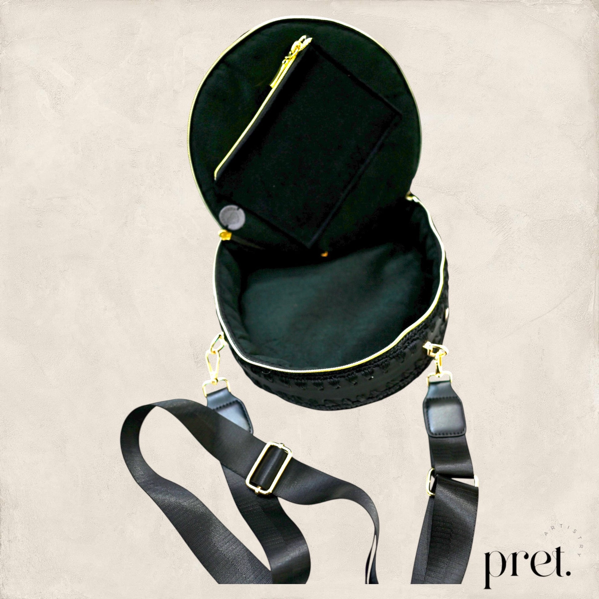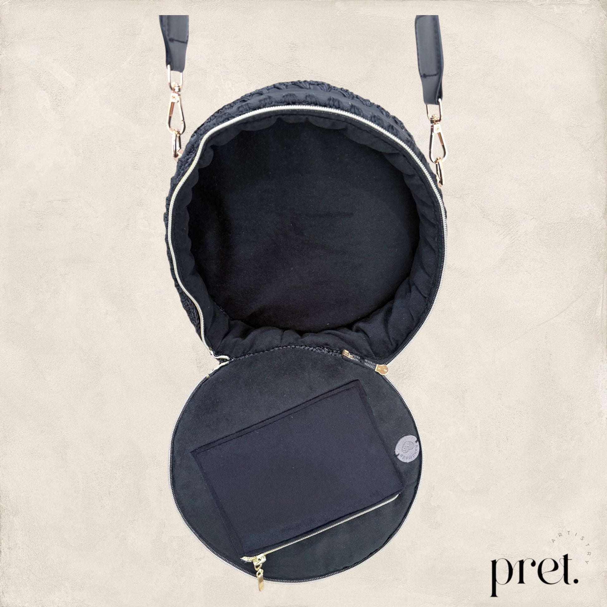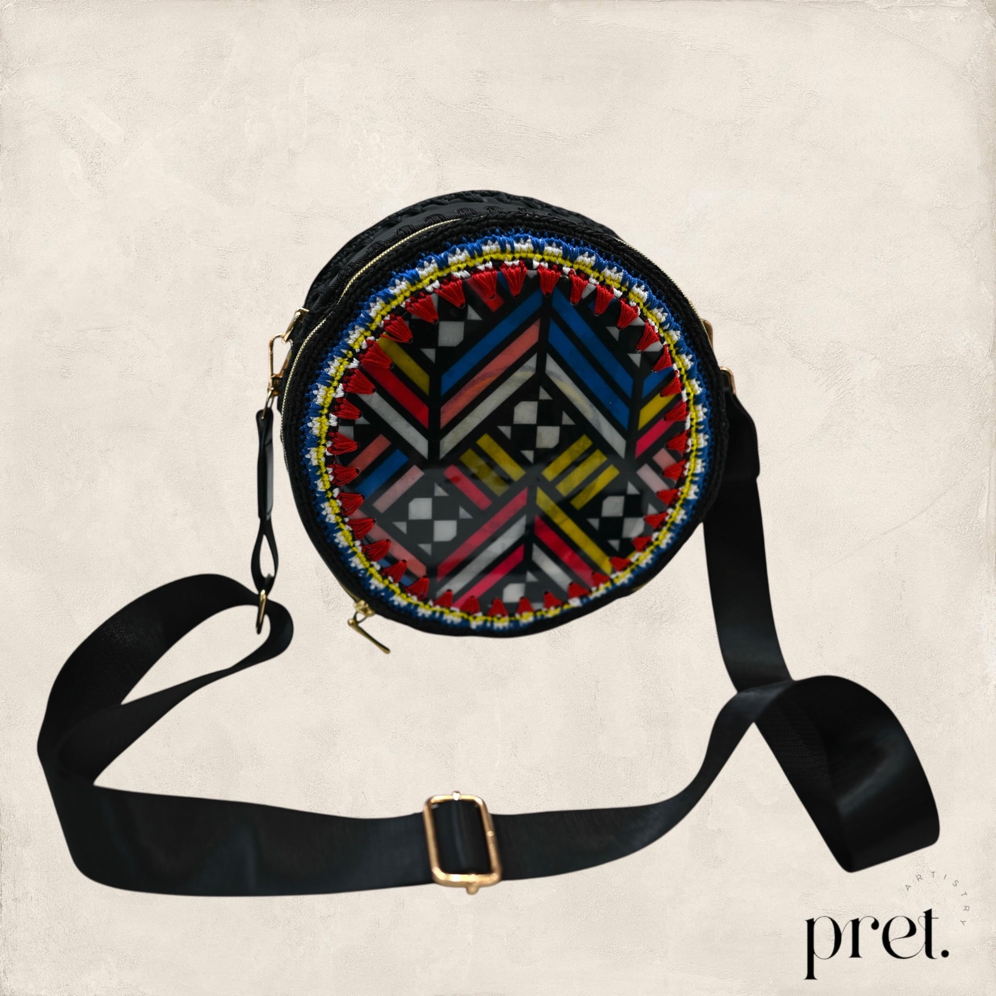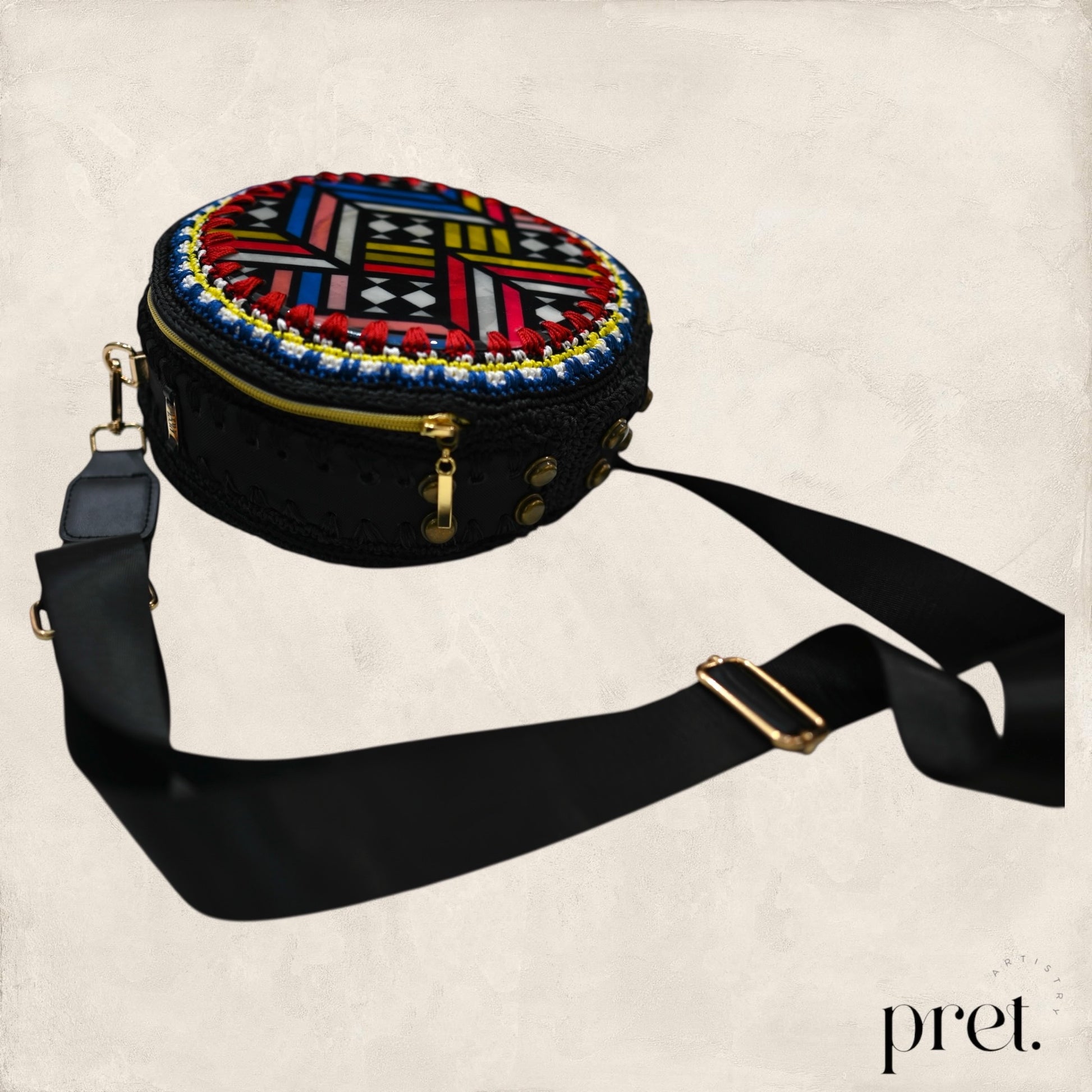 The Graphic Groove handbag features a round shape with a colorful geometric design, black, blue,red,yellow and white crochet edges, and a gold zipper. Its wide adjustable strap offers comfort and style. With a vibrant vinyl record motif and brass rivet details, this unique bag makes a bold statement.