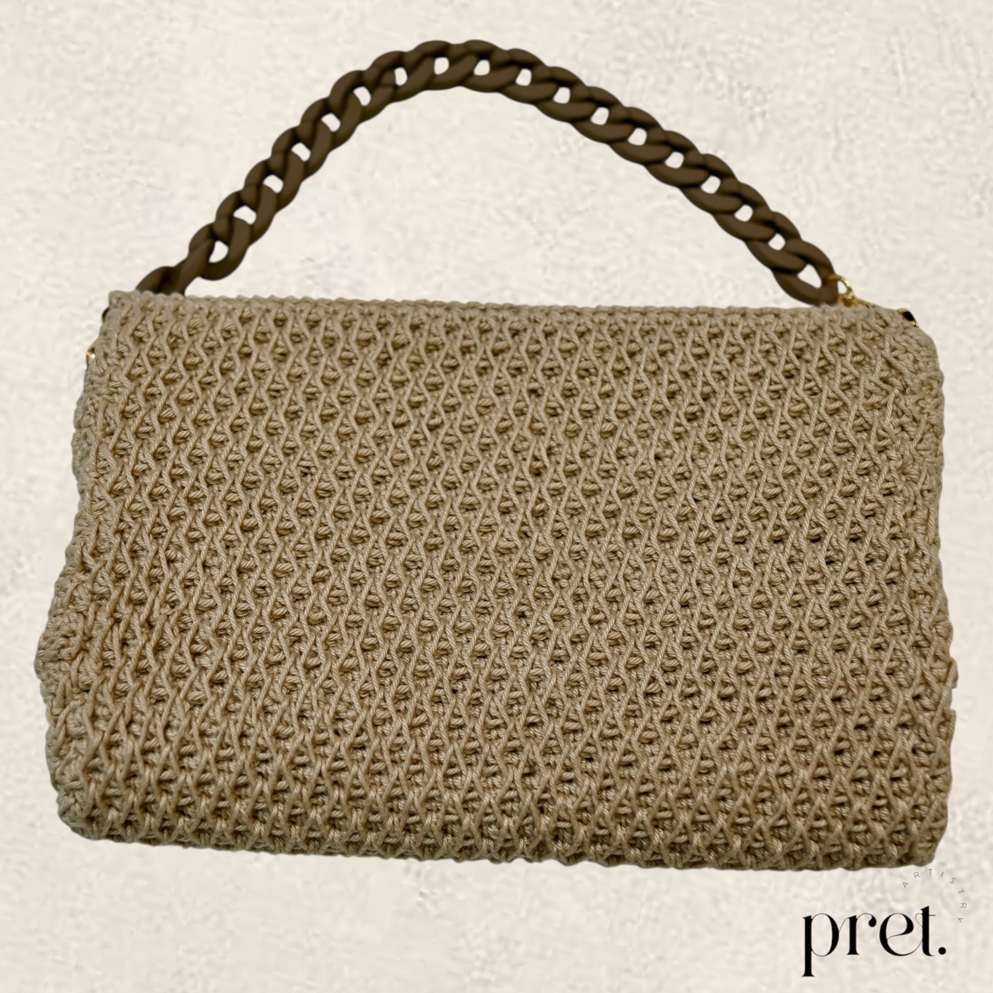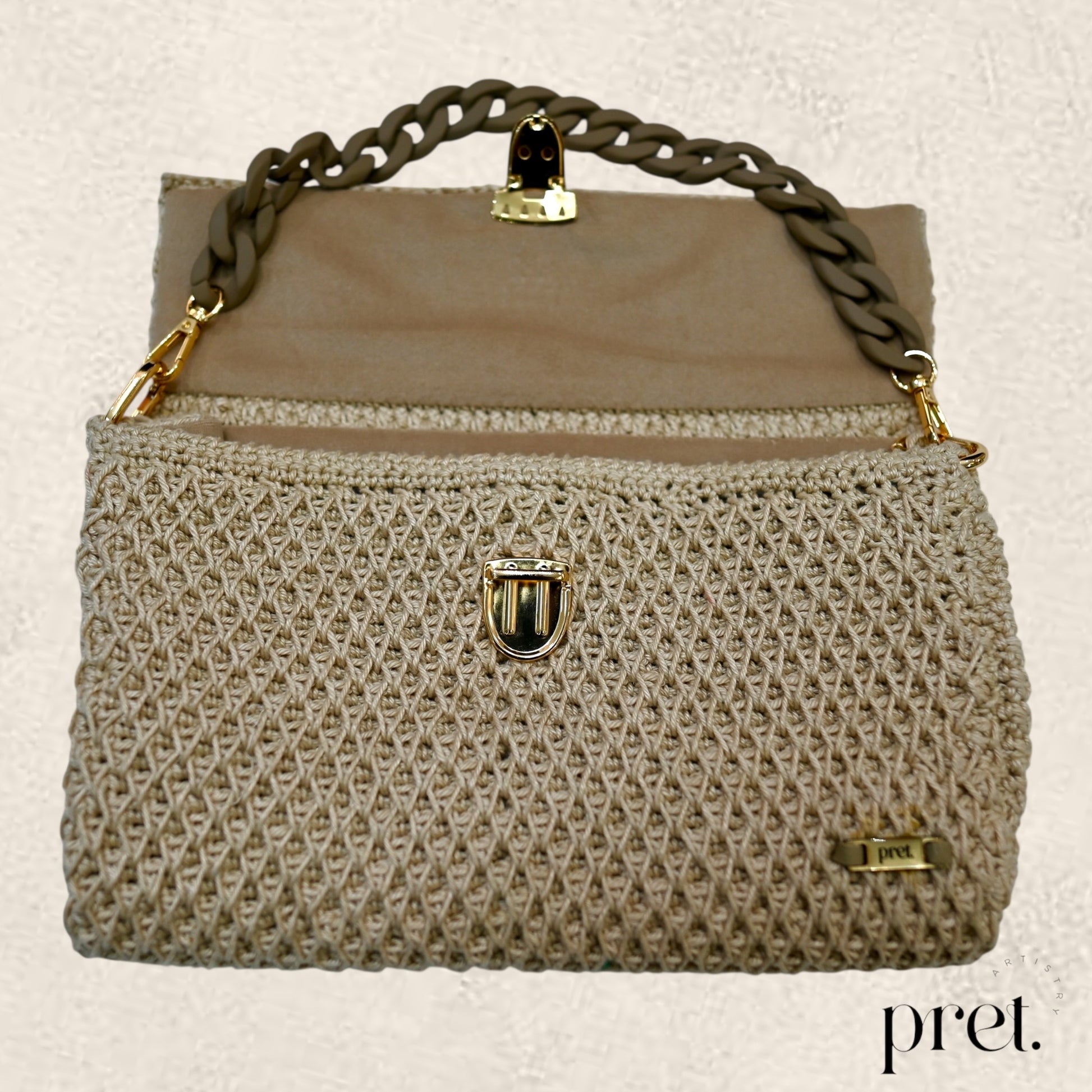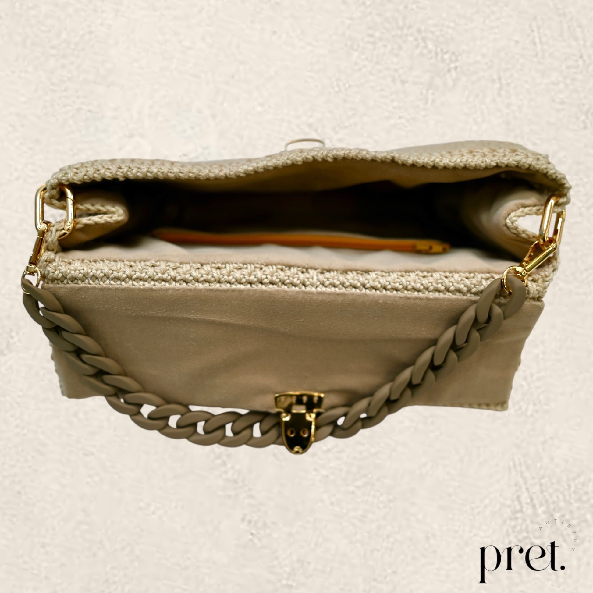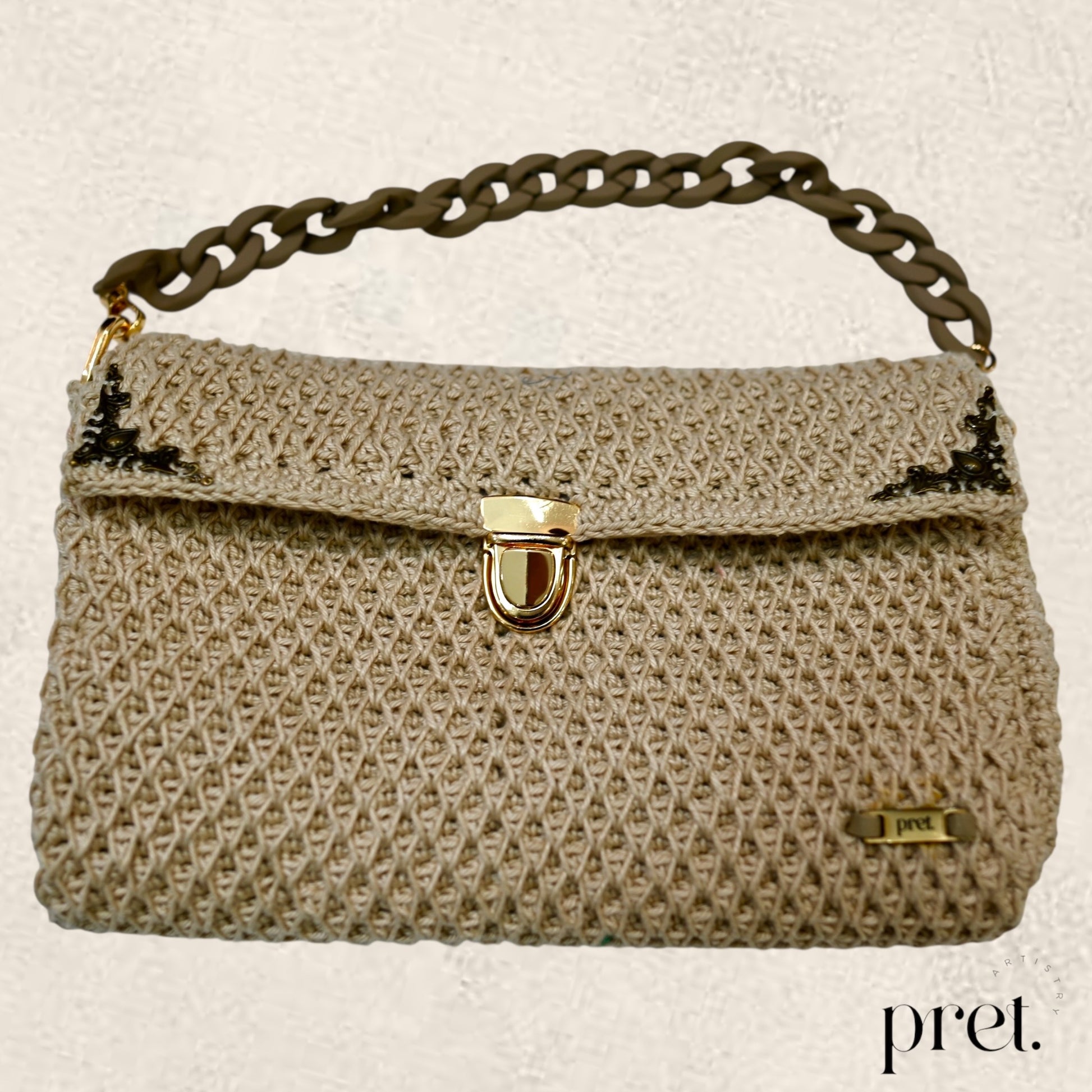 ‘Latte Luxe’ embodies subtle sophistication with its soft beige hue and intricate crochet design. Featuring a matte beige-tone chain handle and plush velvet interior, this piece exudes serene luxury, enhanced by antique brass corner details.