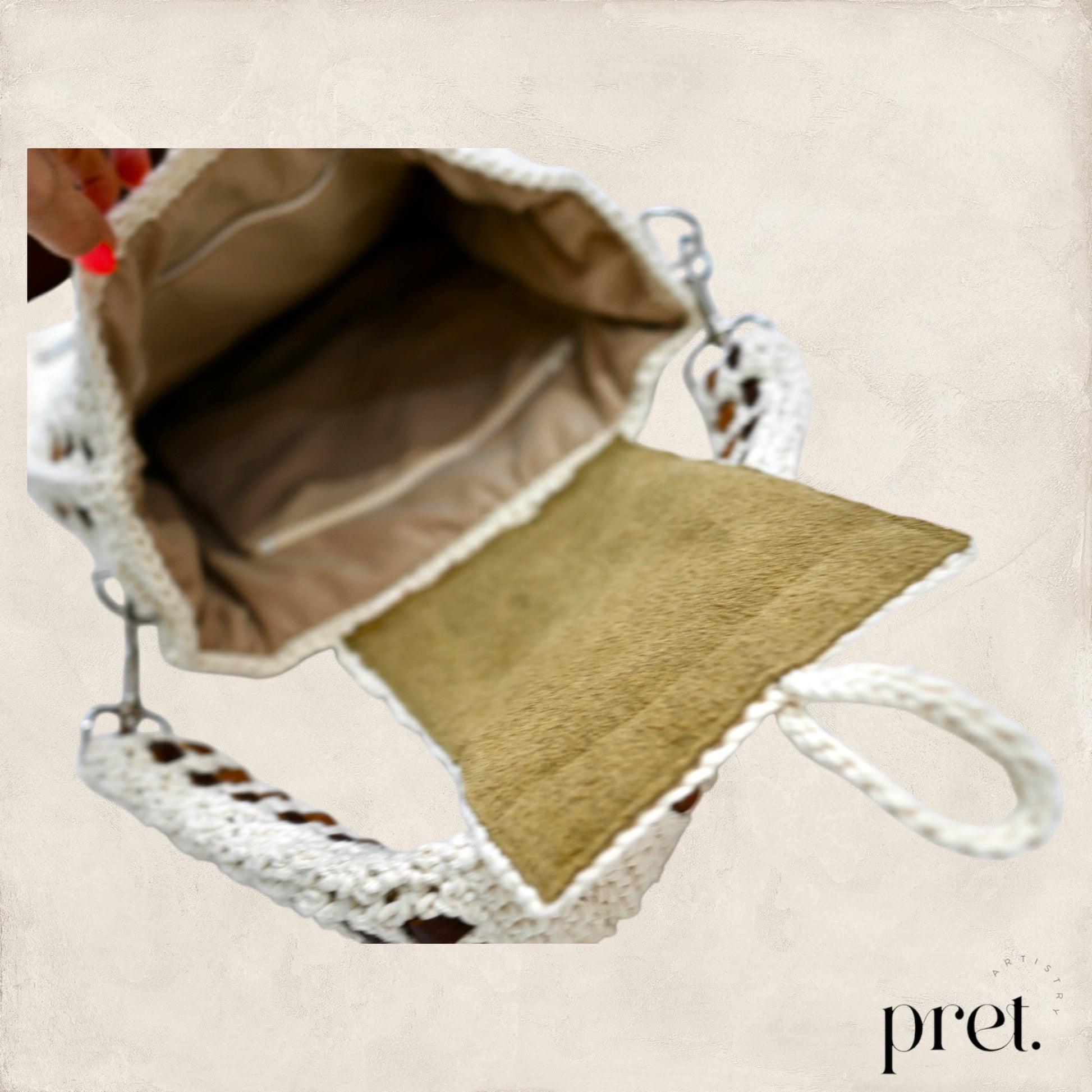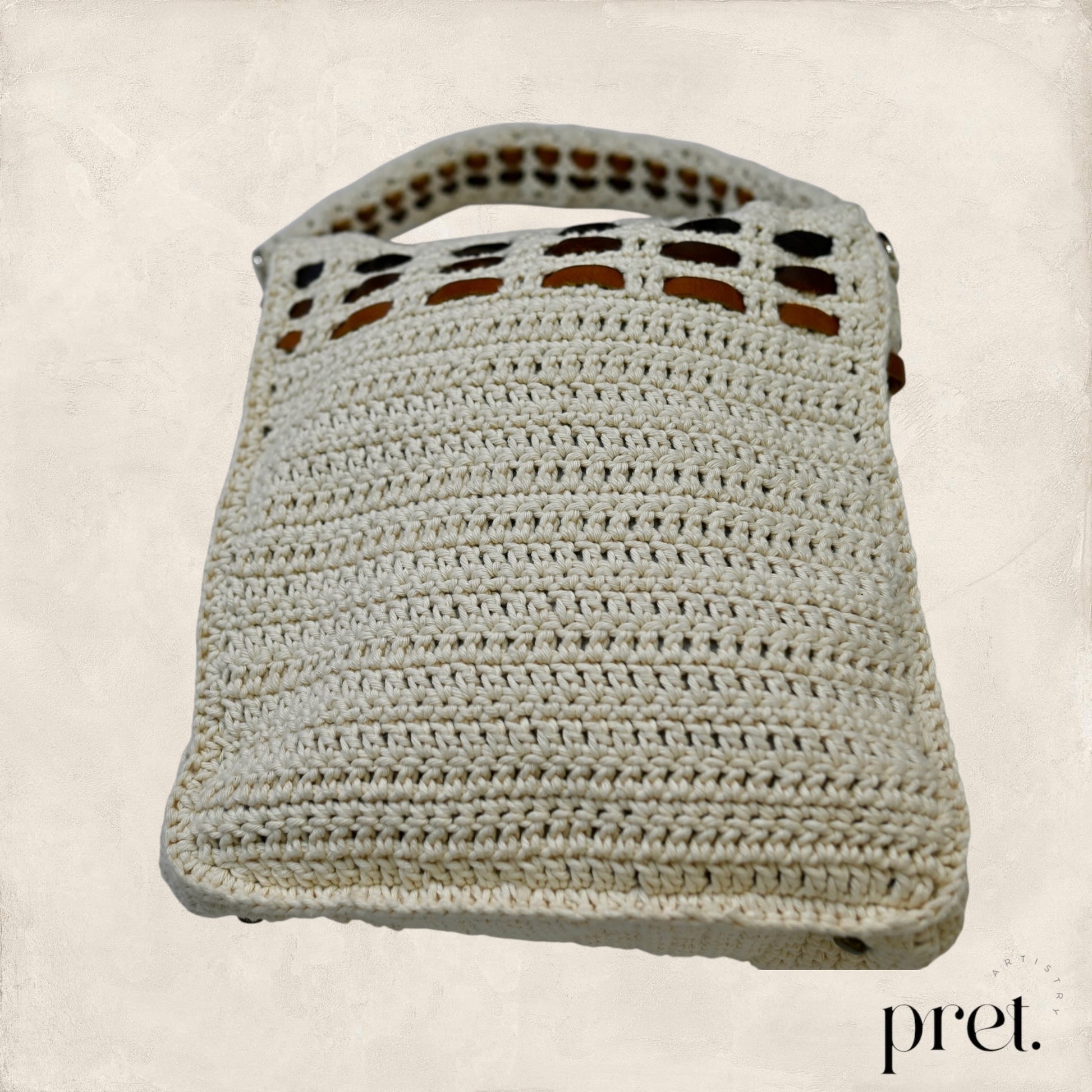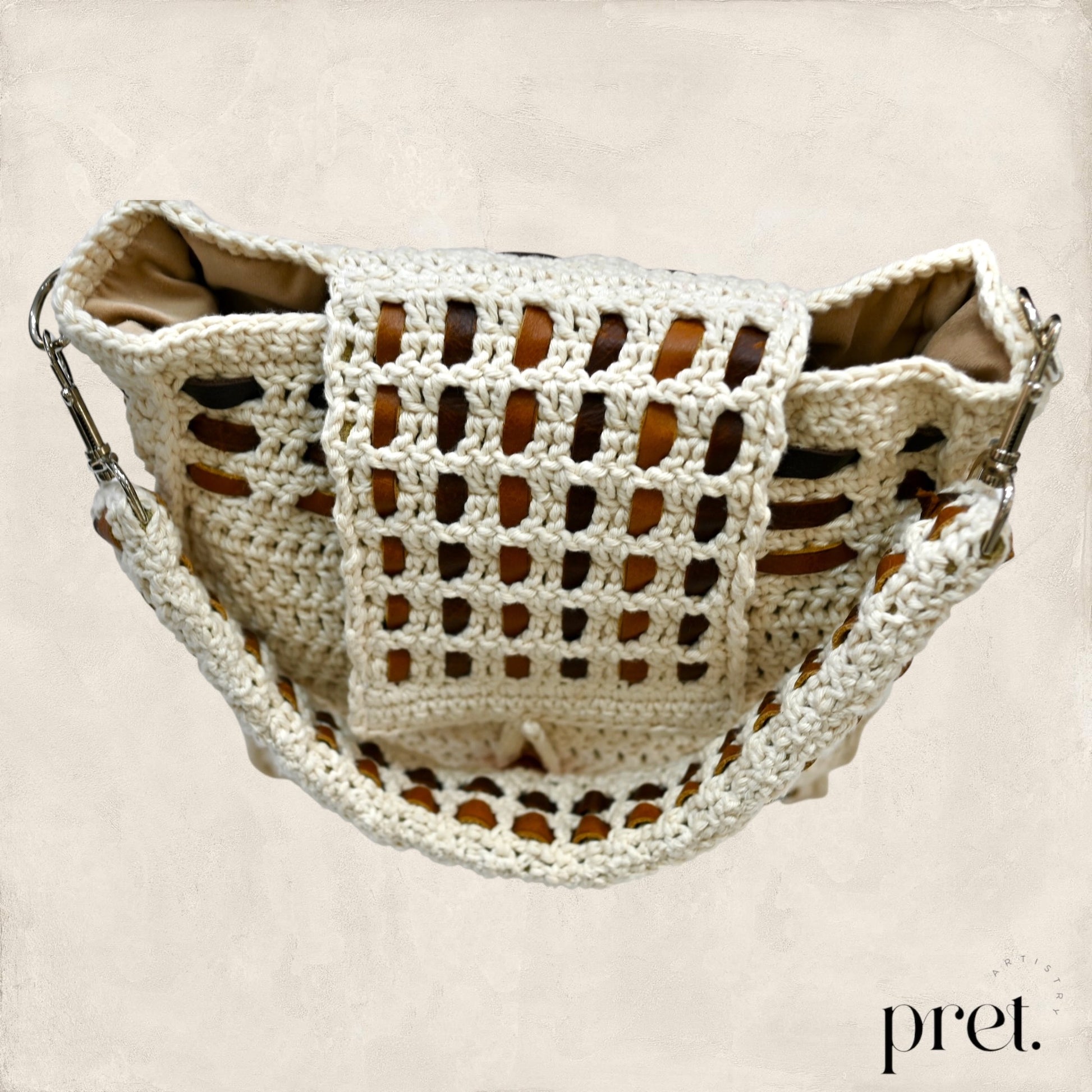 The Milk & Honey shoulder bag showcases earthy tones and intricate crochet work, crafted from organic cotton with genuine leather woven details. Its roomy interior is lined with soft velvet, blending durability with elegance. Designed for comfort, this bag is ideal for those who appreciate expert craftsmanship and sustainable design.