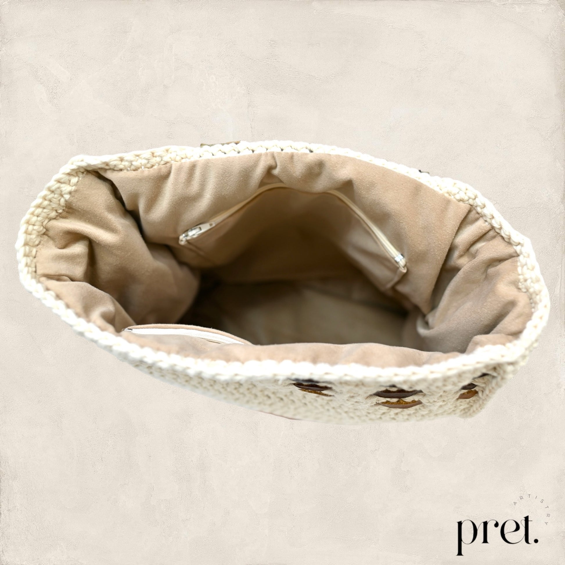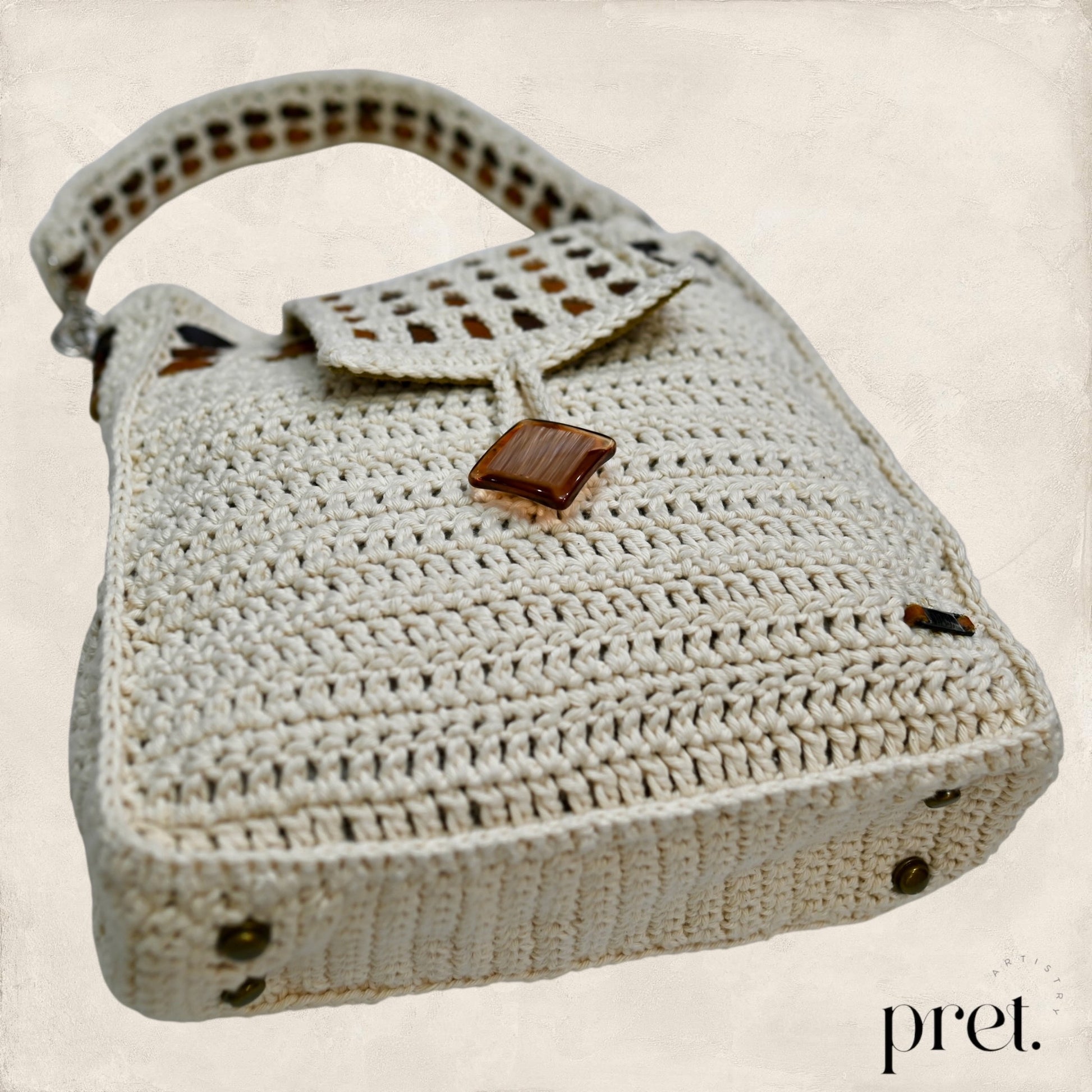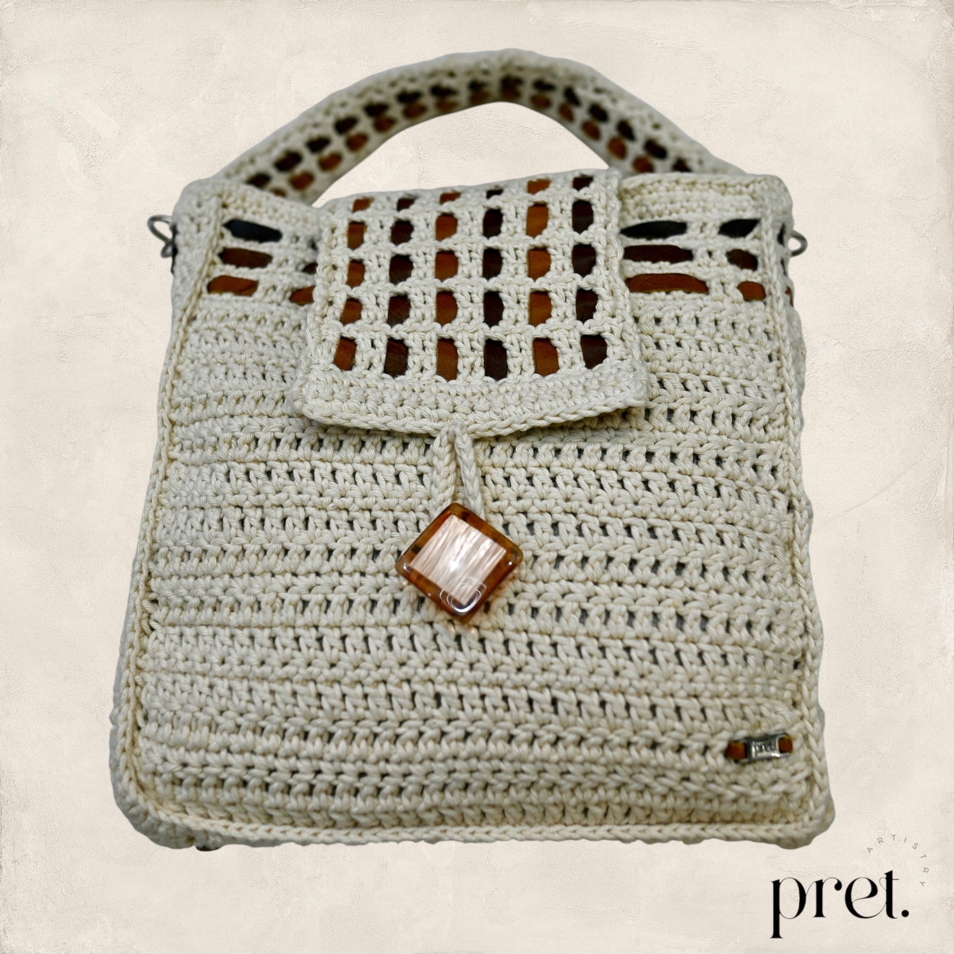 The Milk & Honey shoulder bag showcases earthy tones and intricate crochet work, crafted from organic cotton with genuine leather woven details. Its roomy interior is lined with soft velvet, blending durability with elegance. Designed for comfort, this bag is ideal for those who appreciate expert craftsmanship and sustainable design.