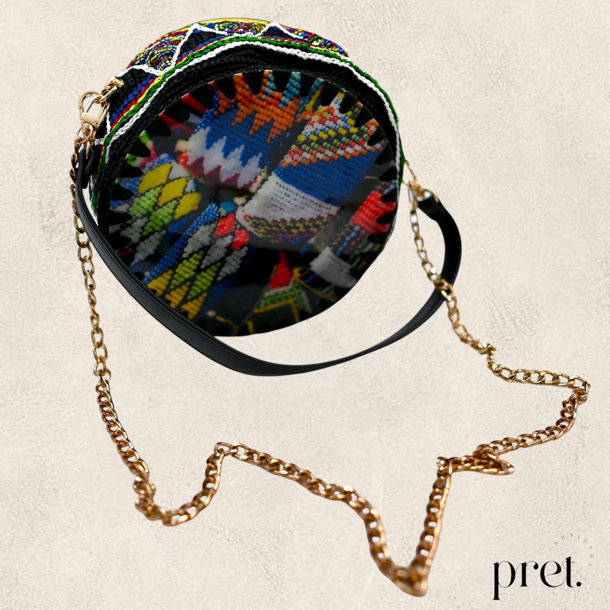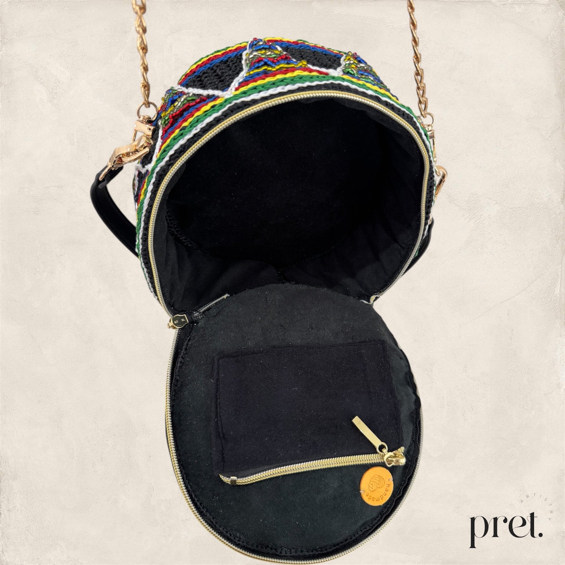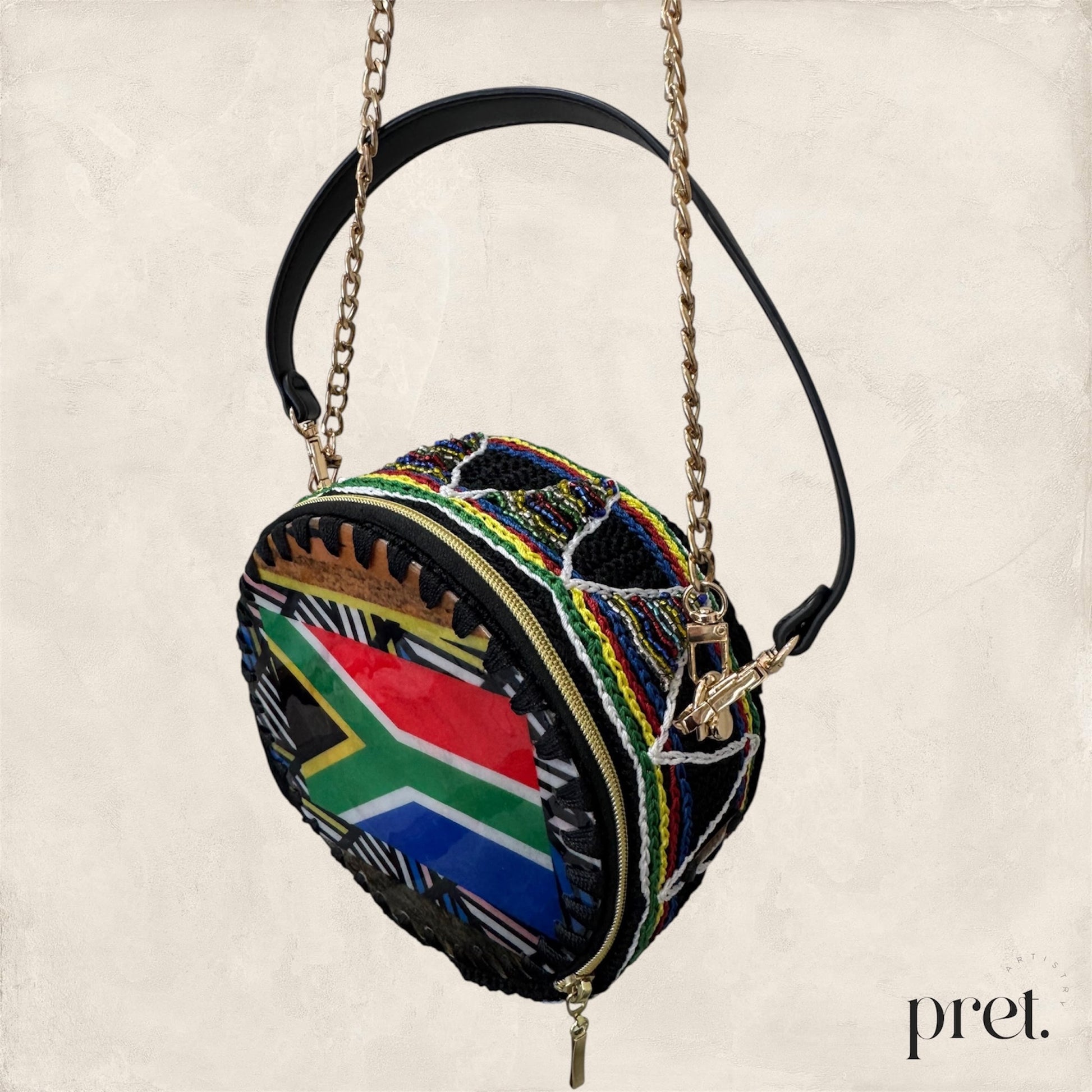 The Mzansi Muse is a distinctive circular handbag showcasing two vinyl panels: one displays the South African flag crafted from resin-coated linen, while the other features resin-encased linen beadwork. Framed by black crochet and vibrant beadwork inspired by traditional designs, it is equipped with gold-tone hardware, a velvet-lined interior, and a zippered pocket to securely hold your essentials.