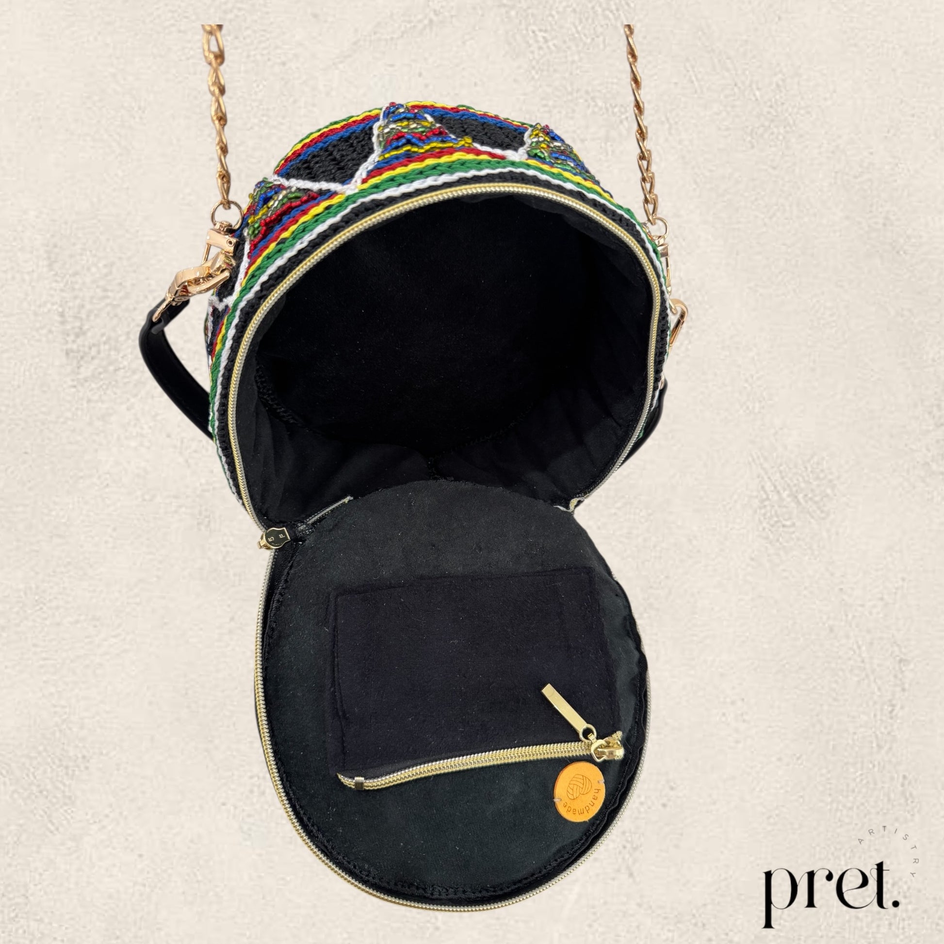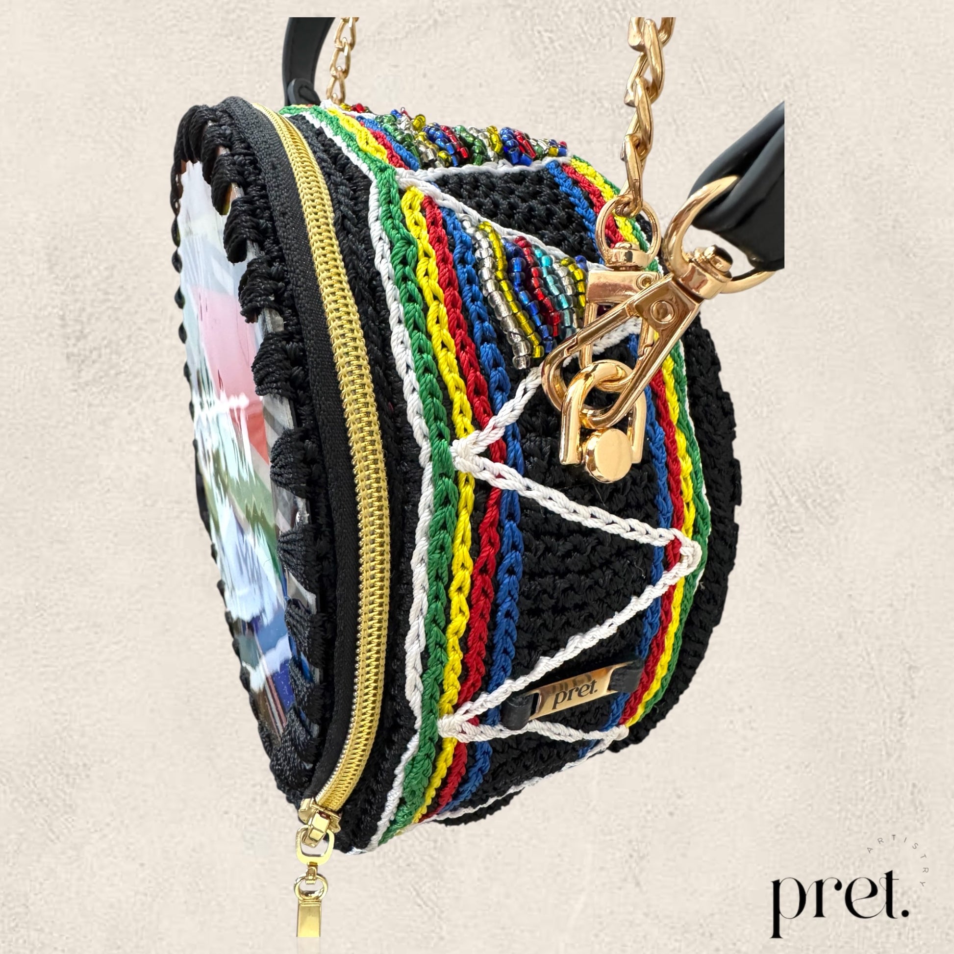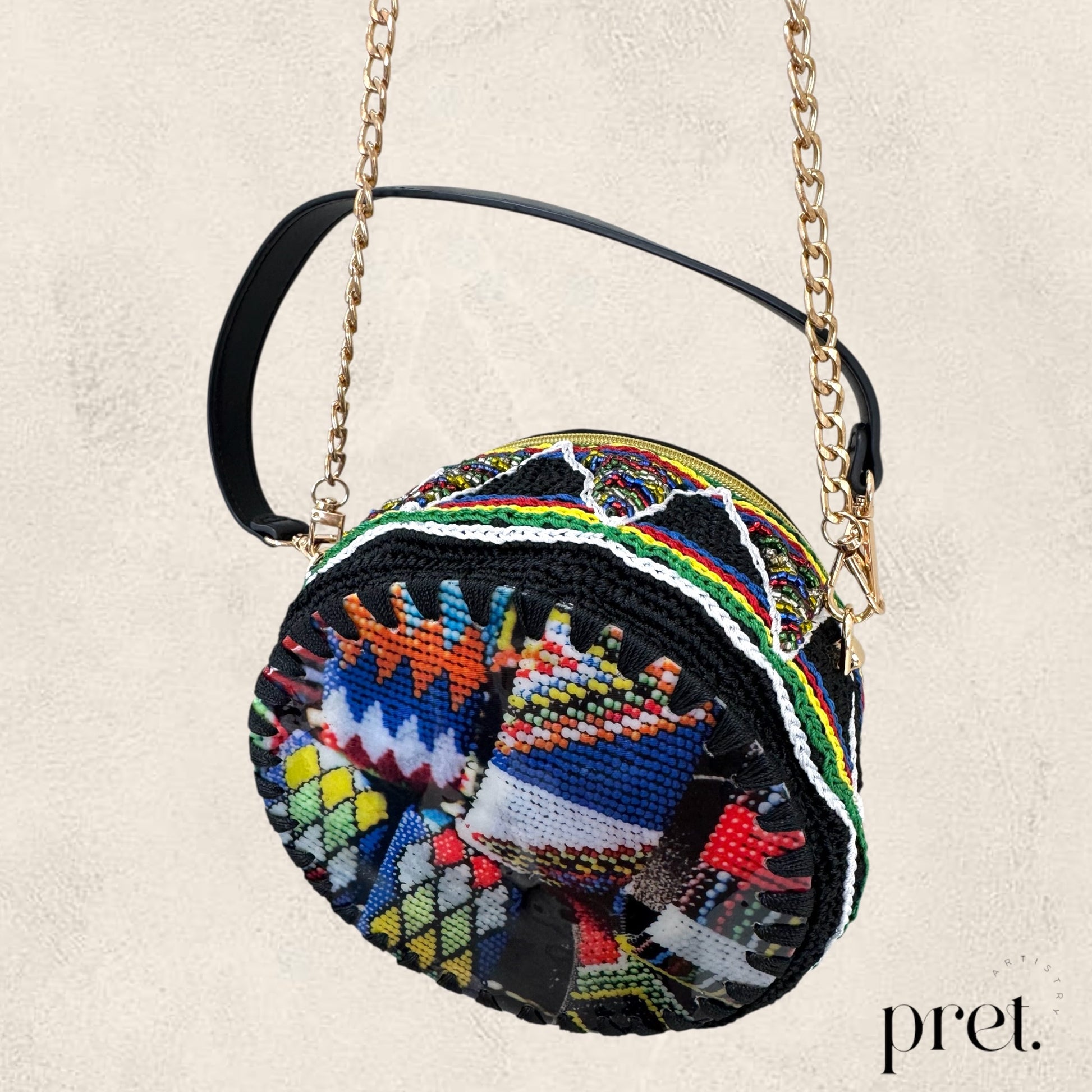 The Mzansi Muse is a distinctive circular handbag showcasing two vinyl panels: one displays the South African flag crafted from resin-coated linen, while the other features resin-encased linen beadwork. Framed by black crochet and vibrant beadwork inspired by traditional designs, it is equipped with gold-tone hardware, a velvet-lined interior, and a zippered pocket to securely hold your essentials.
