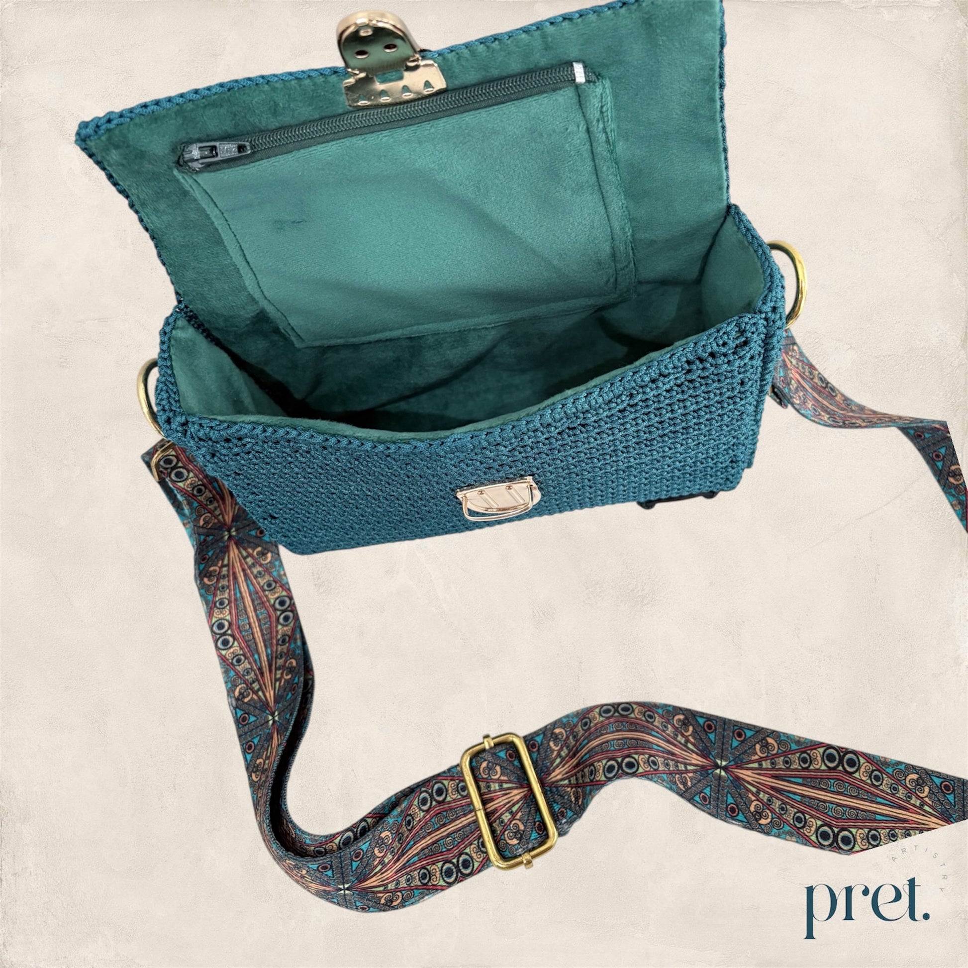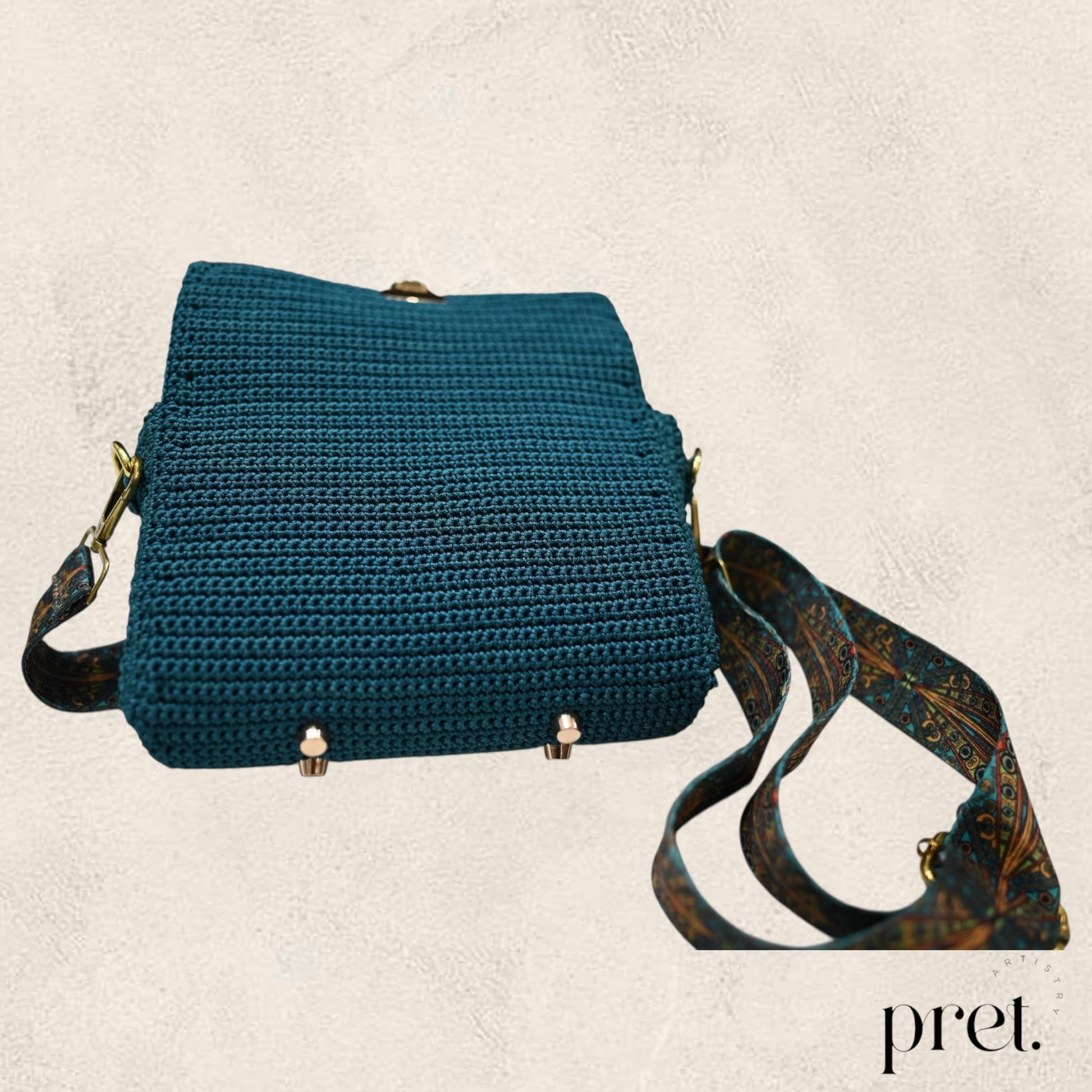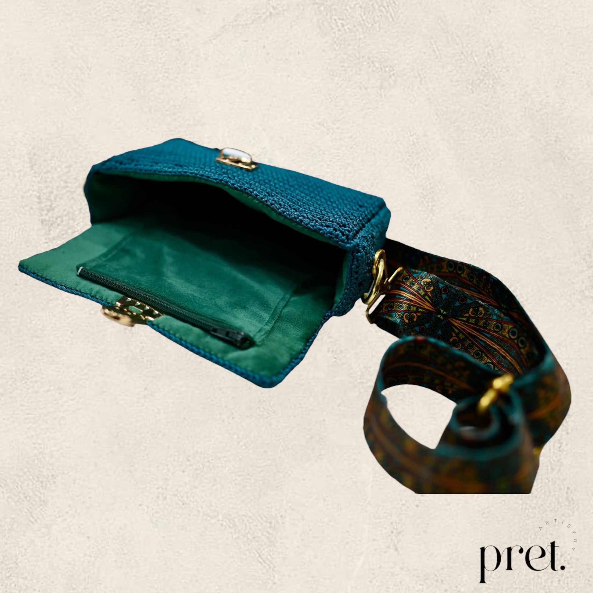 The Peacock bag combines deep teal Silky Polyester crochet with gold hardware and a peacock-patterned strap. It features a gold clasp, protective metal feet, and a green velvet-lined interior with a zip pocket. This elegant, handcrafted handbag adds a touch of luxury and style to any outfit.