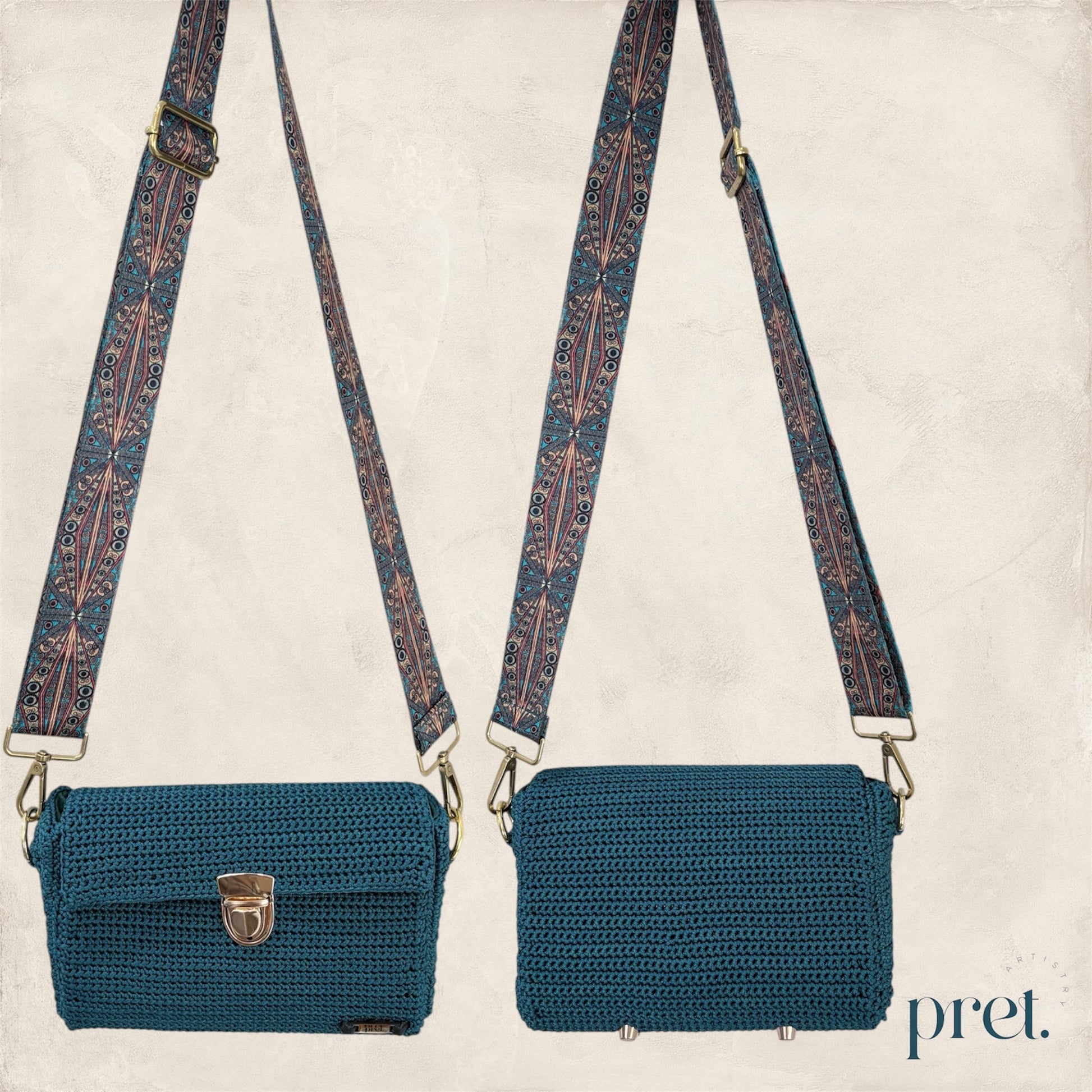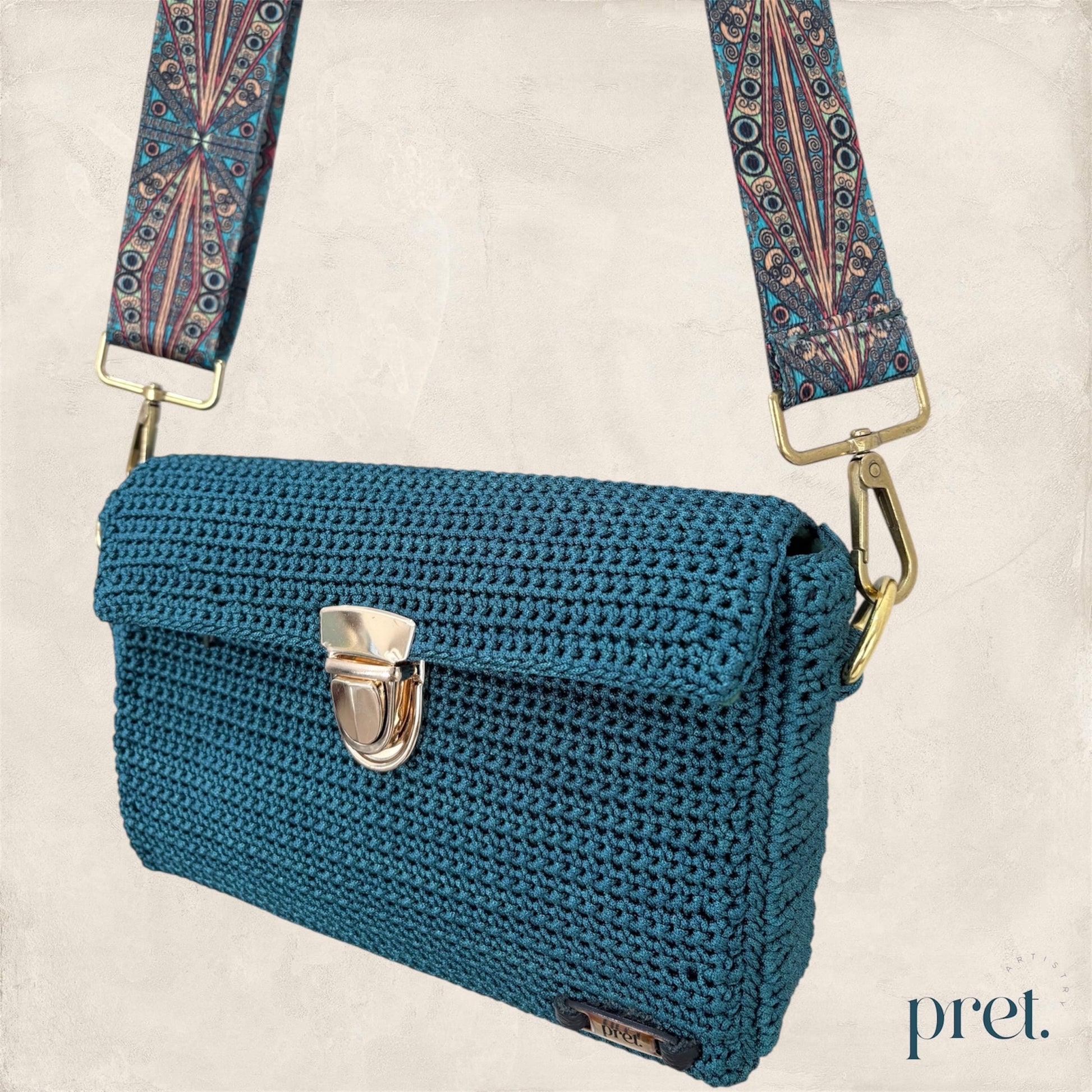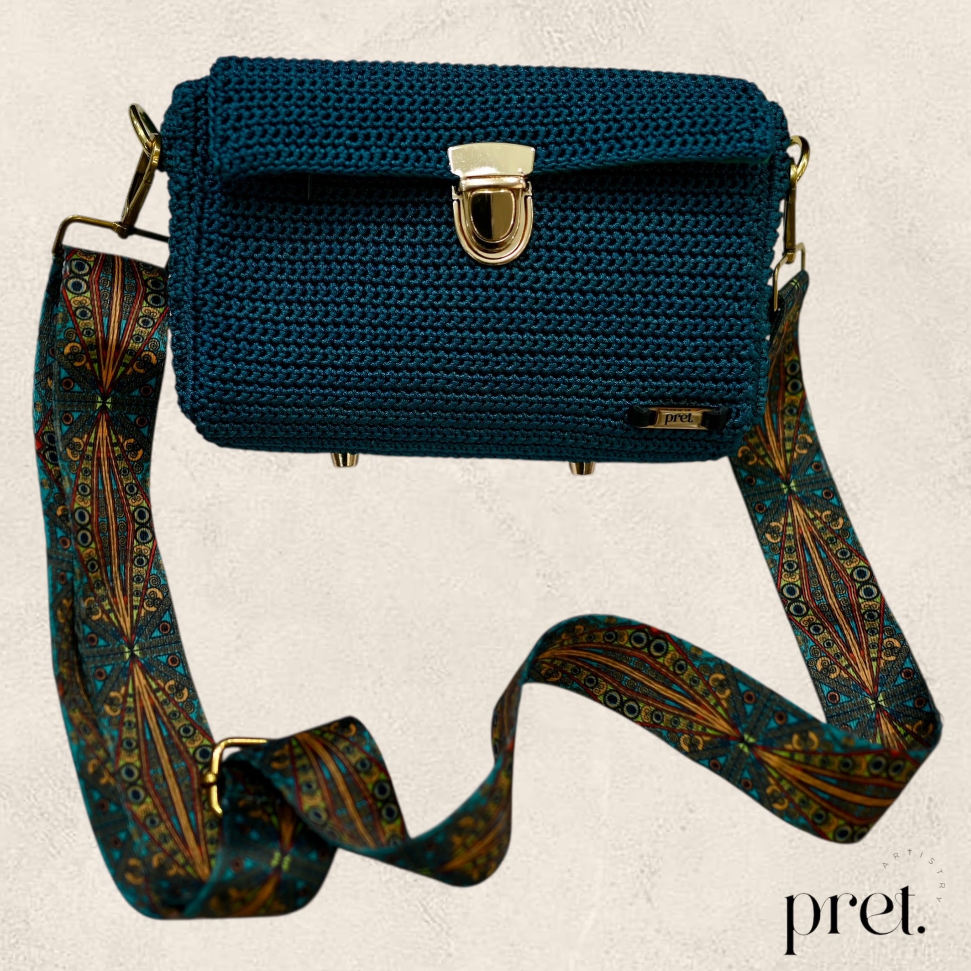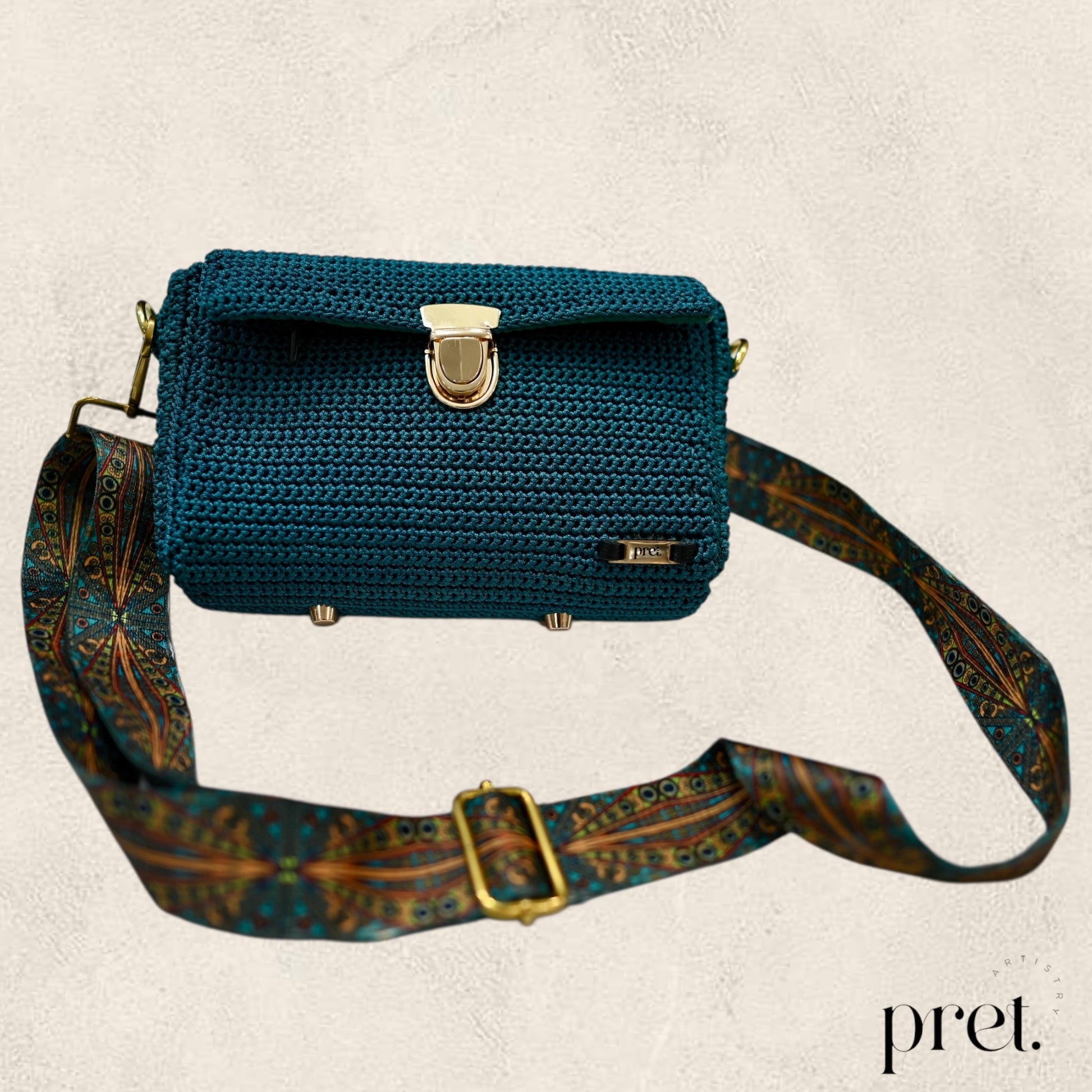 The Peacock bag combines deep teal Silky Polyester crochet with gold hardware and a peacock-patterned strap. It features a gold clasp, protective metal feet, and a green velvet-lined interior with a zip pocket. This elegant, handcrafted handbag adds a touch of luxury and style to any outfit.