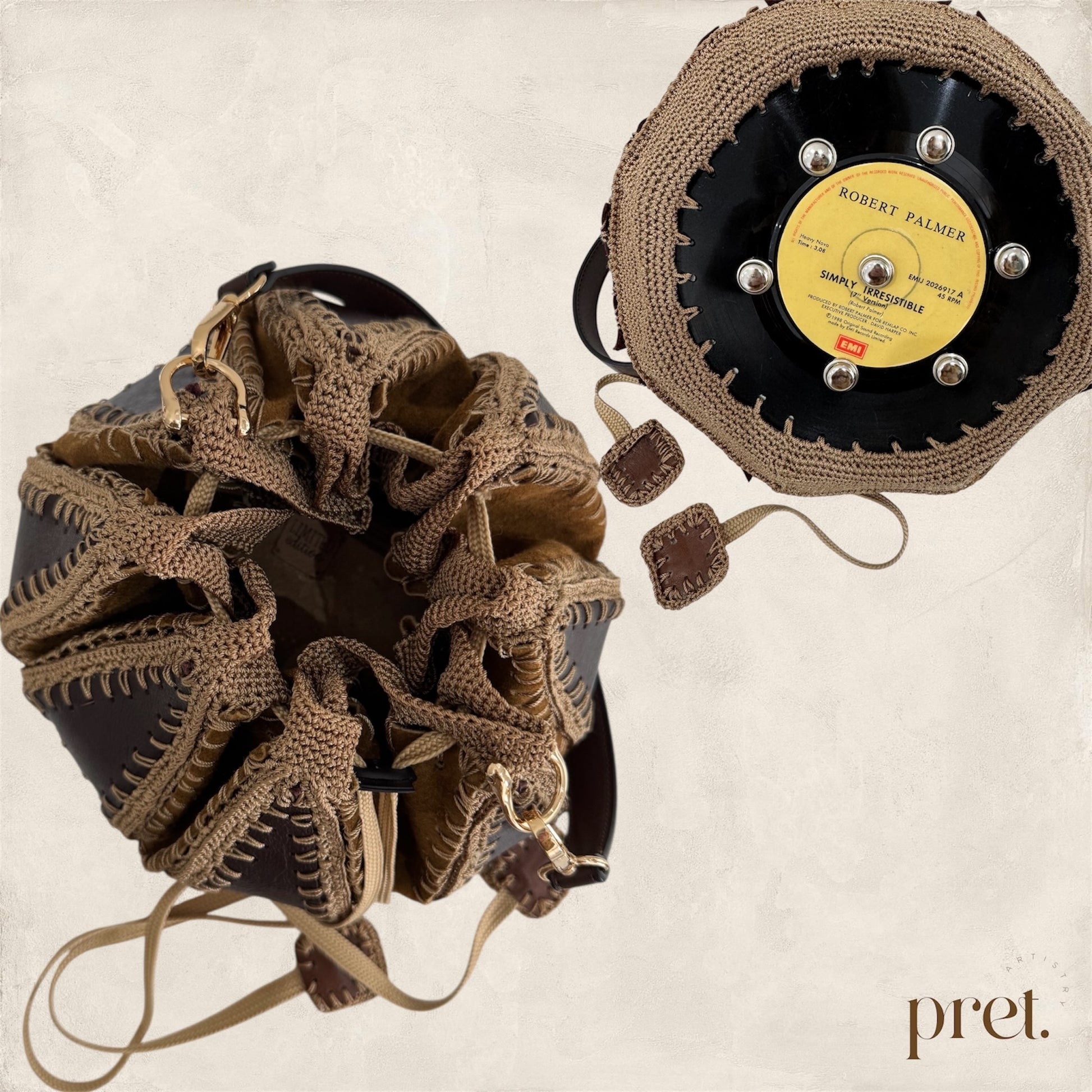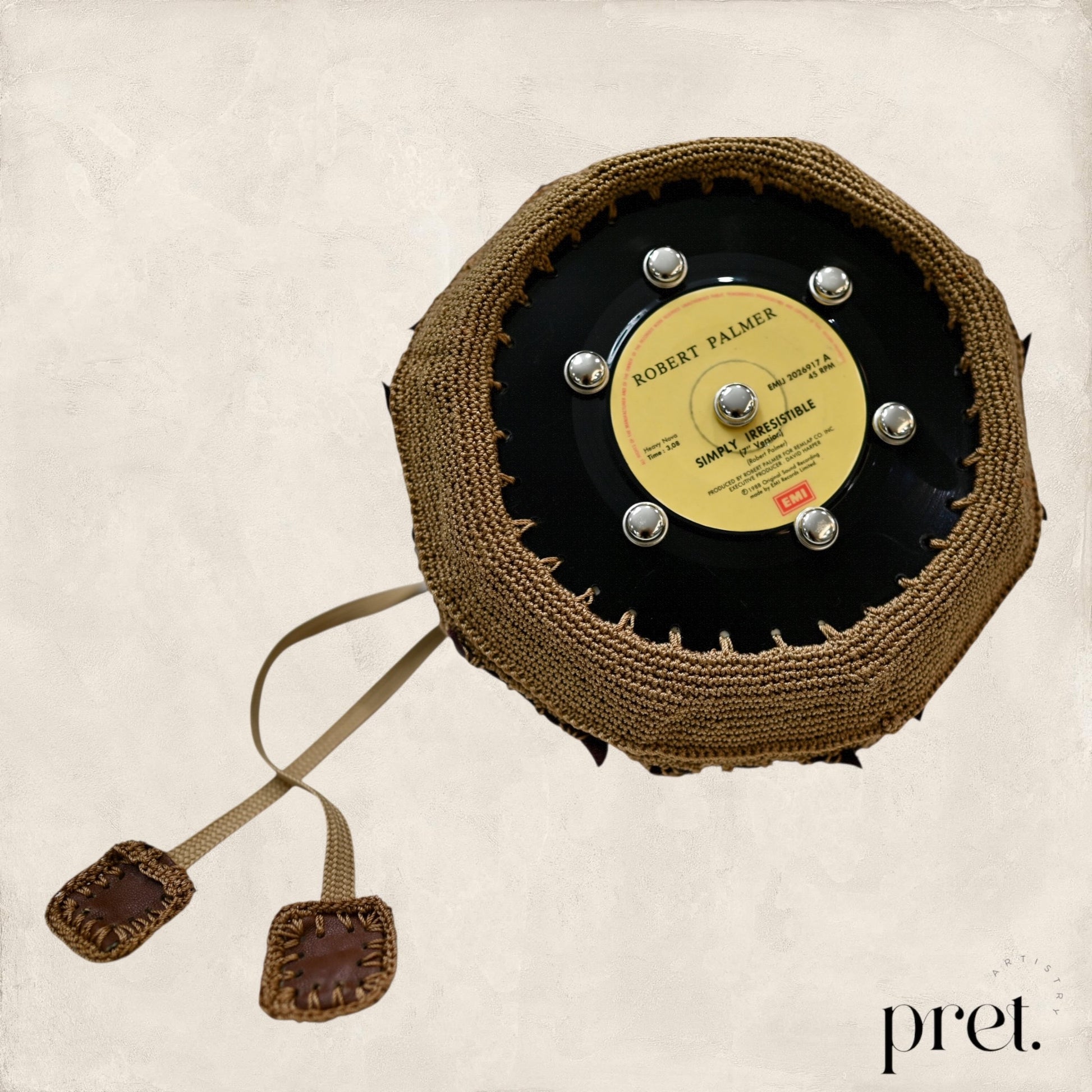 Make a striking impression with Simply Irresistible, a unique bucket bag crafted from a vinyl record that blends retro charm with contemporary design. This exclusive accessory showcases authentic leather panels, intricate crochet stitching, a secure drawstring closure, and a base made from Robert Palmer’s iconic “Simply Irresistible” vinyl, seamlessly merging art, music, and style.