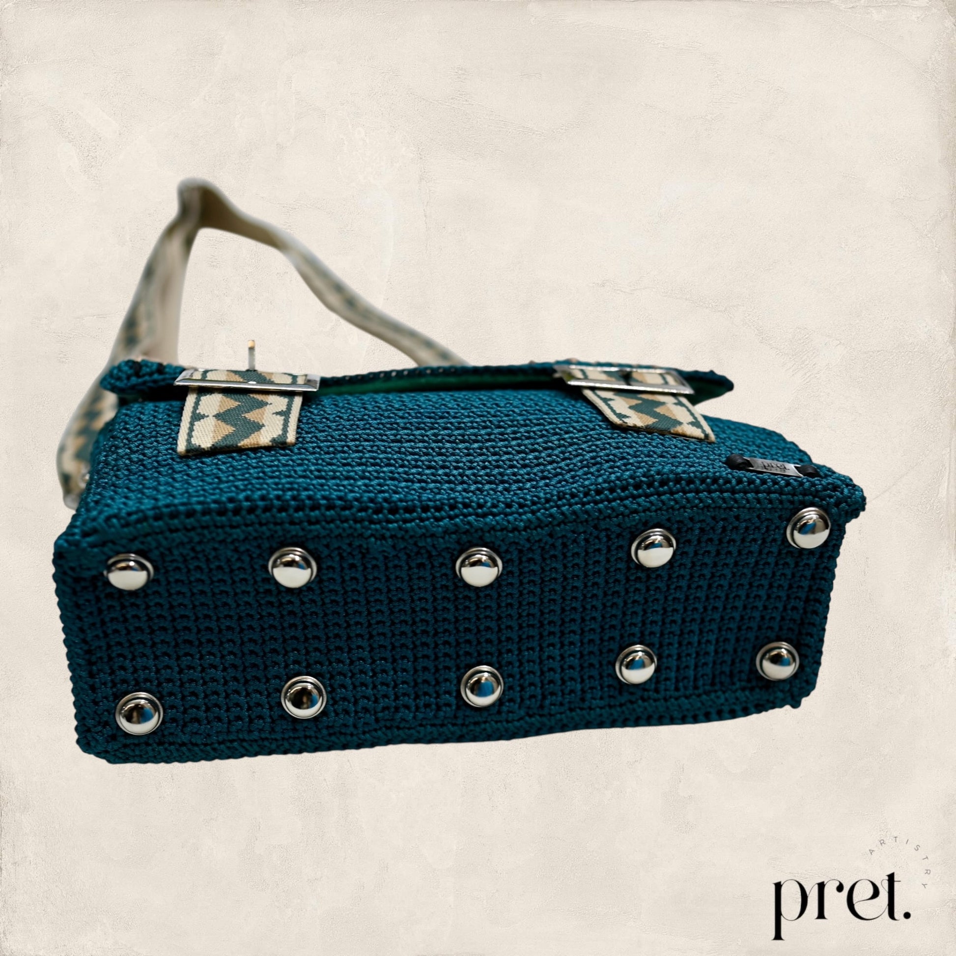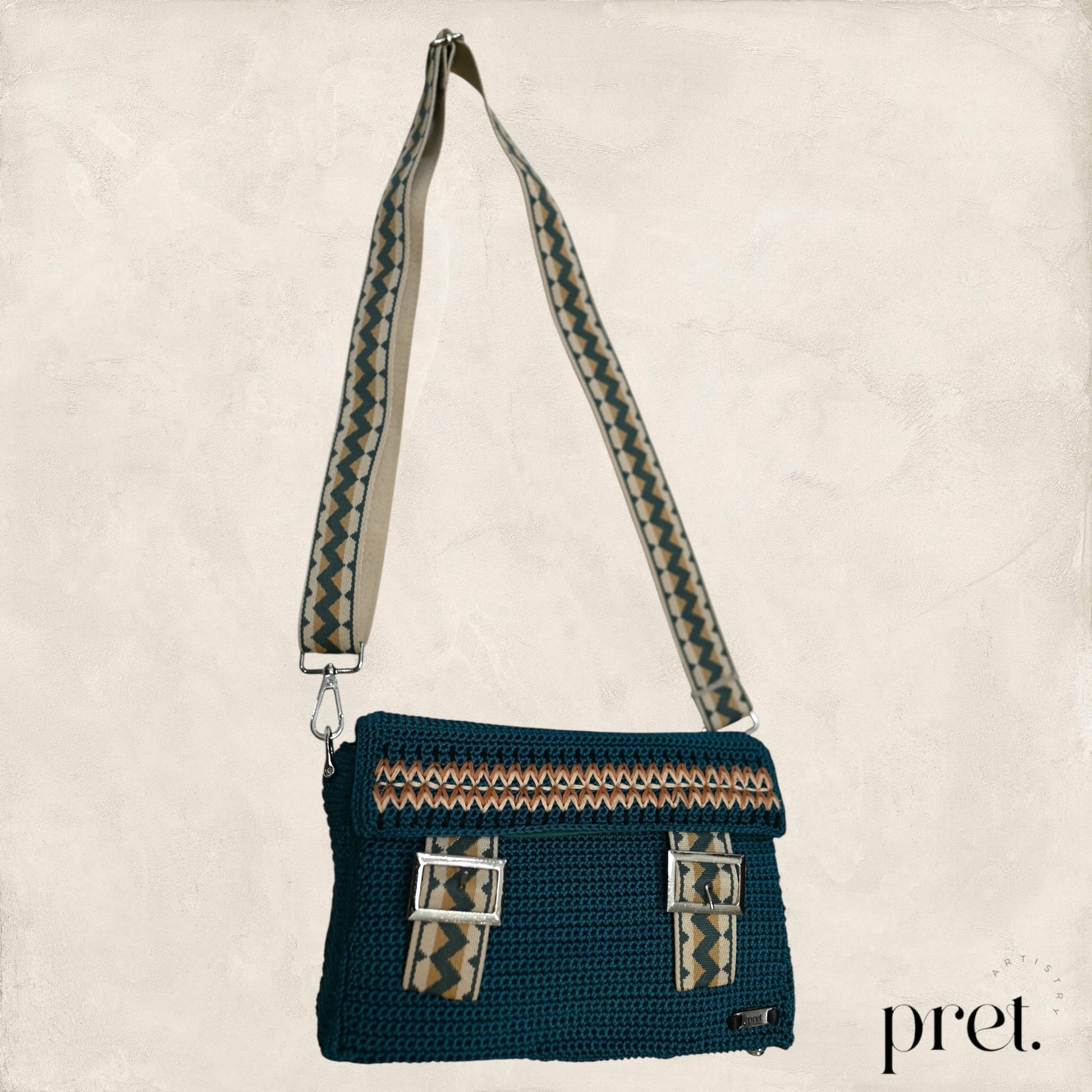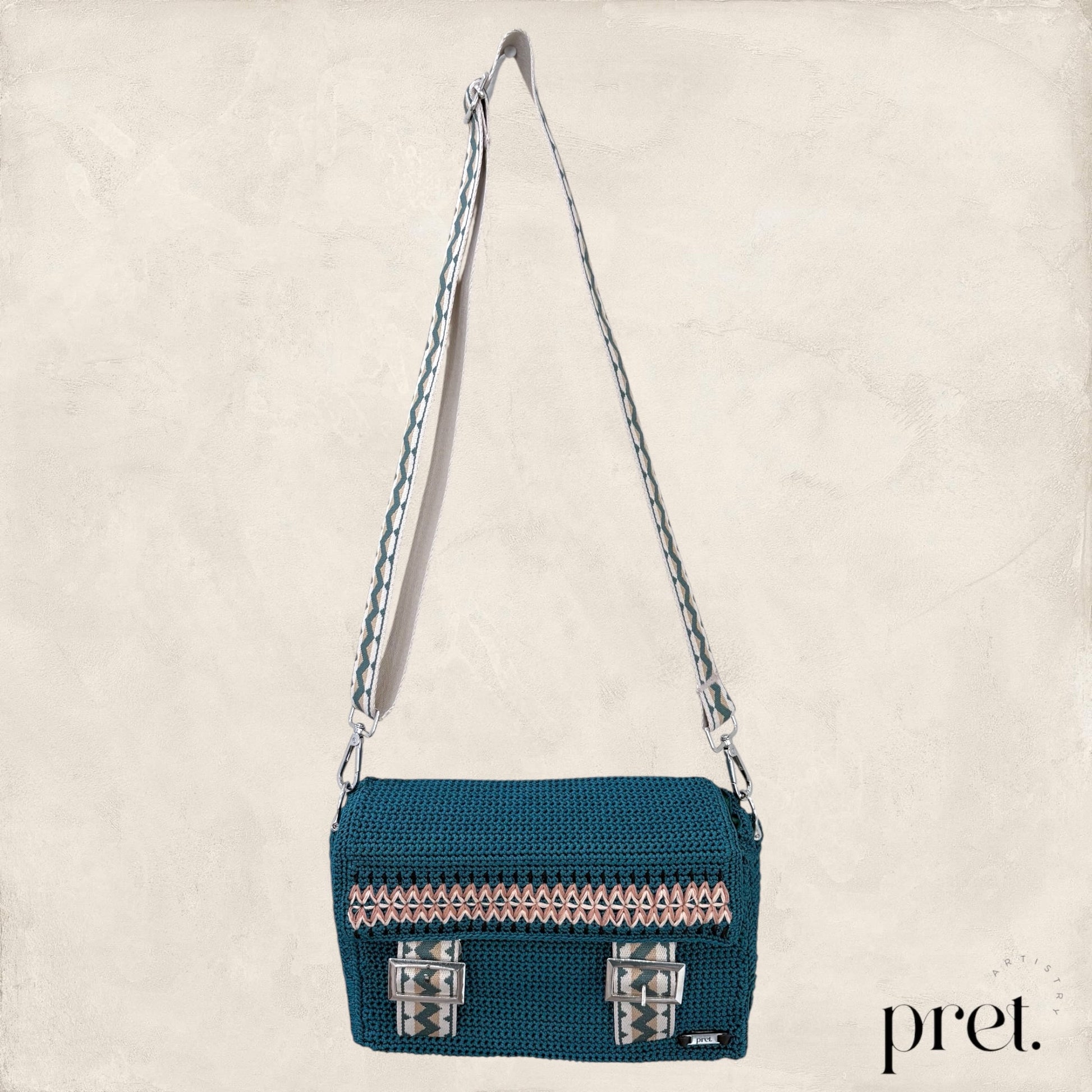 The Teal Stitch is a handmade shoulder bag in rich teal crochet with detailed stitching on the flap. It has patterned buckles and an adjustable woven strap for a stylish touch. Inside, it features a soft velvet lining with a zip pocket. Its sturdy structure and metal feet keep it durable and polished. A perfect bag to add unique style to any outfit.
