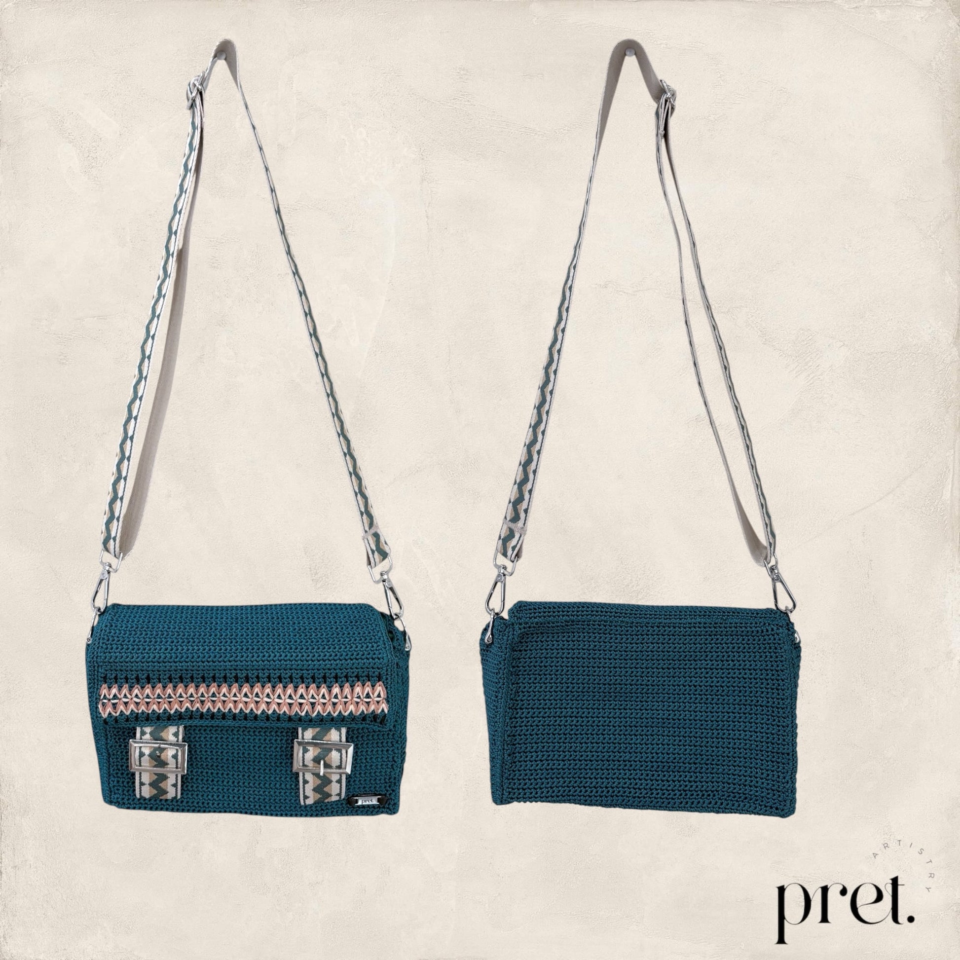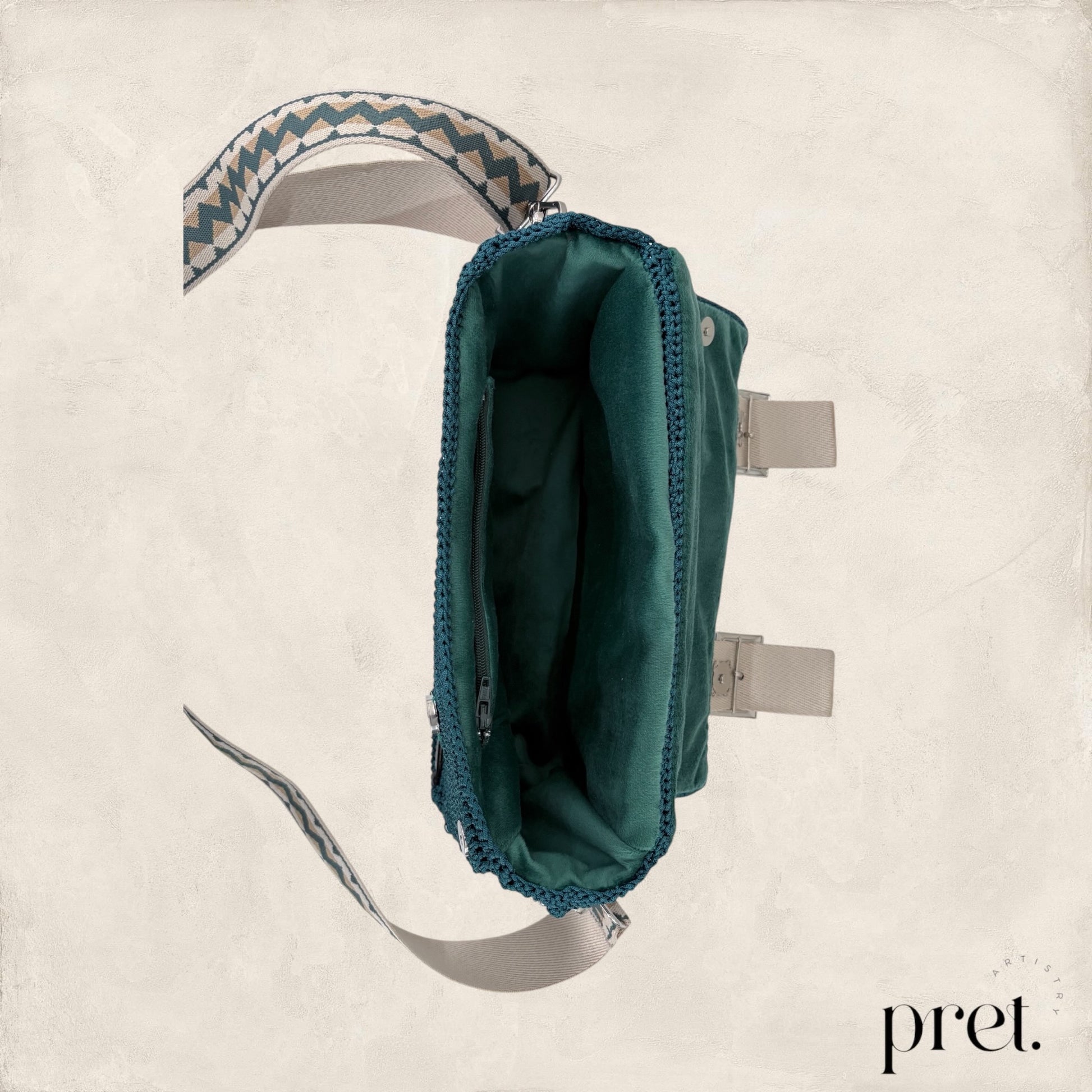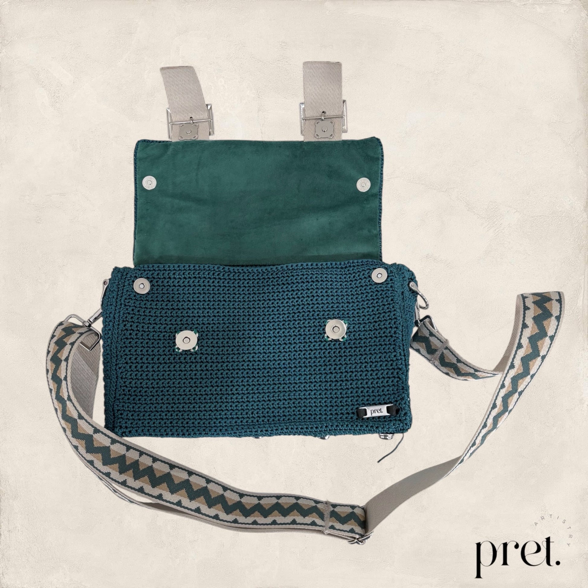 The Teal Stitch is a handmade shoulder bag in rich teal crochet with detailed stitching on the flap. It has patterned buckles and an adjustable woven strap for a stylish touch. Inside, it features a soft velvet lining with a zip pocket. Its sturdy structure and metal feet keep it durable and polished. A perfect bag to add unique style to any outfit.